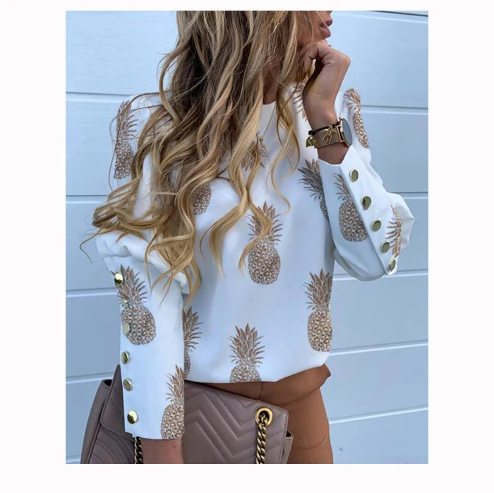 Jocoo Jolee Women Metal Buttons Long Sleeve Blouse Office Lady Shirt Casual Pineapple Print Tops Oversized Casual Loose Blouses