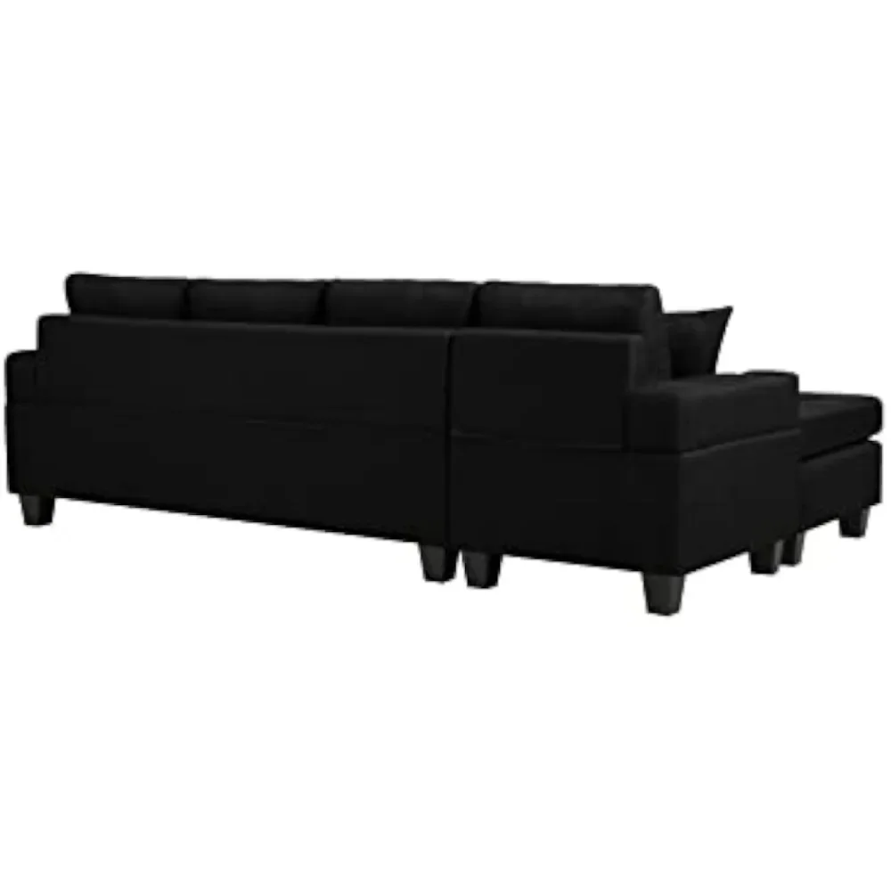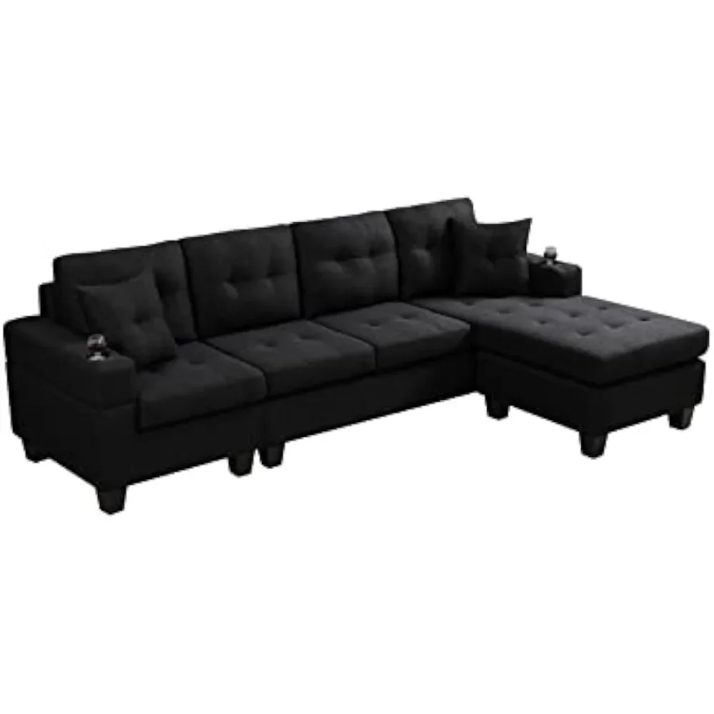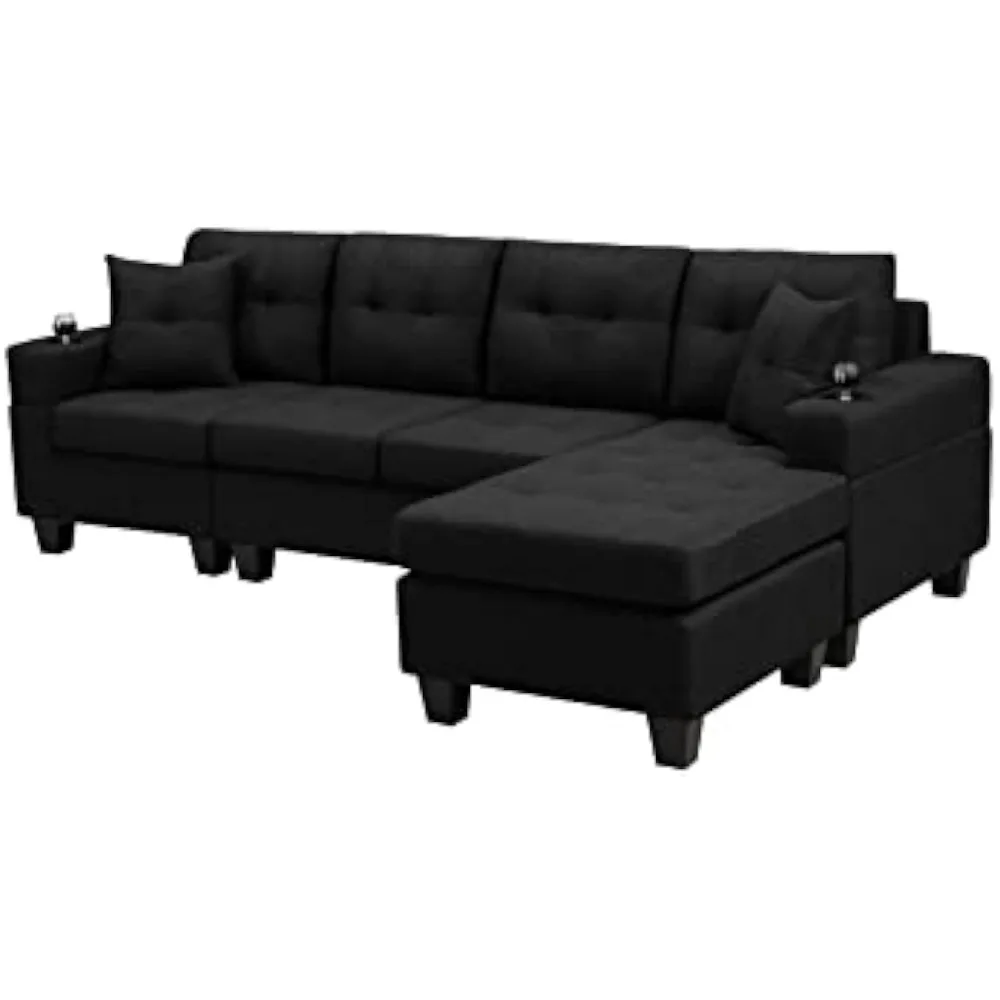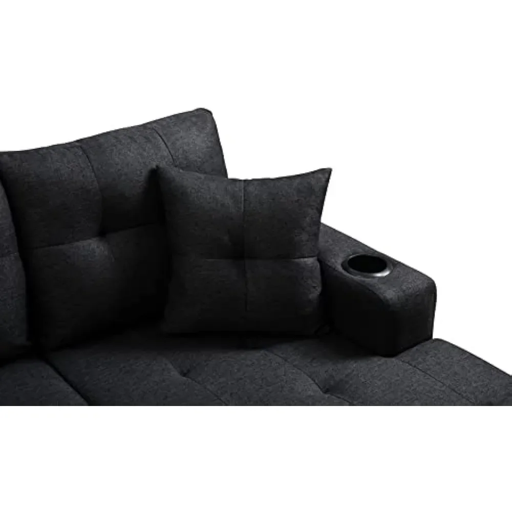 L-shaped Upholstered Modular Sofa with Reversible Chaise Longue and 2 Cup Holders, Modern Furniture Stylish Design, Black