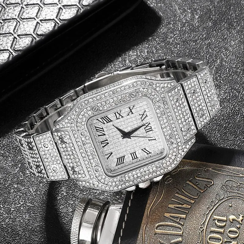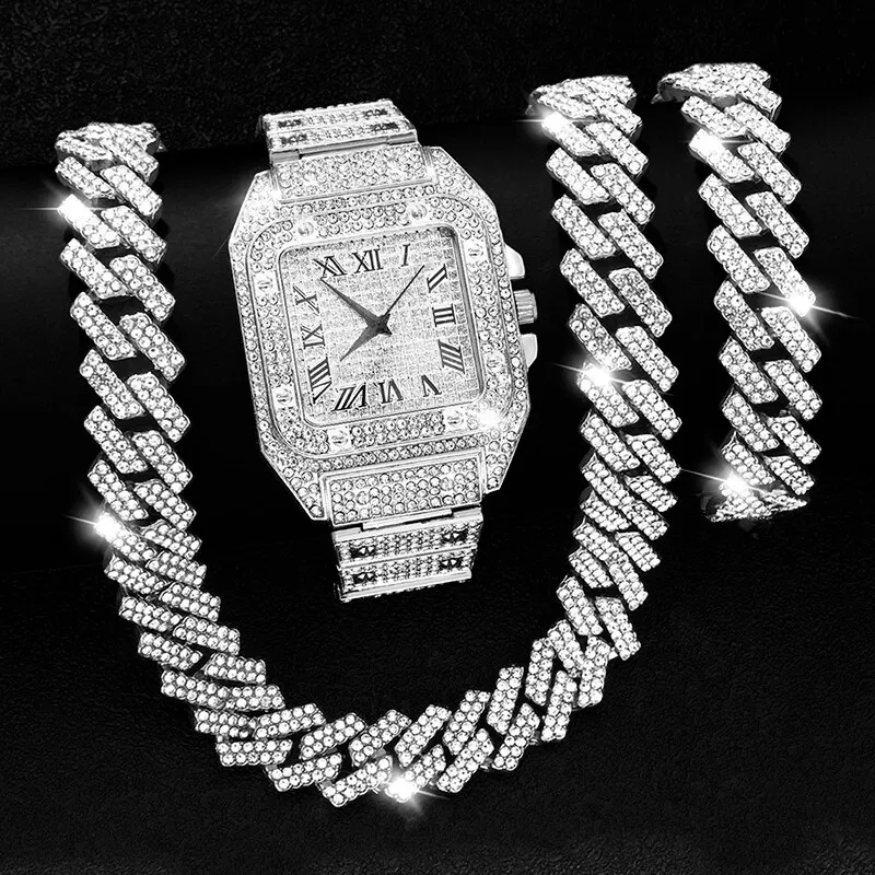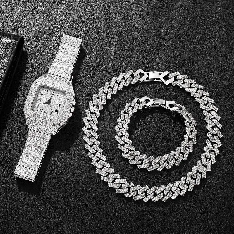 Necklace+Watch+Bracelet Iced Out Watch For Men Hip Hop 14MM Prong Cuban Chain Rapper Cuban Necklaces Set Punk Party Jewelry Gift