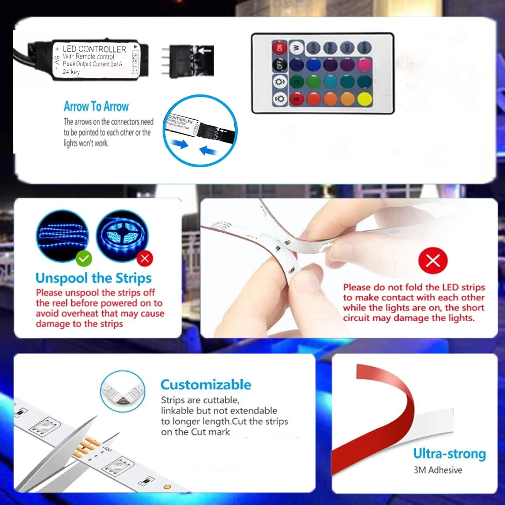 1. The gentle strip may be managed by distant management, activate/flip off, modify the brightness, choose the colour(8 colours), and select the mode(JUMP3/JUMP7/FADE3/FADE7)