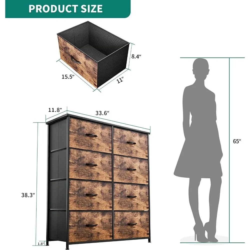 • LARGE STORAGE CAPACITY- The YITAHOME 8-Drawer dresser conveniently organizes your garments, scarves, socks, T-shirts, pants, sun shades, books, small toys, and many others.; Overall dimensions: 33.6″ L x 11.8″ W x 38.3″ H; Drawer dimensions: 15.5″ L x 11″ W x 8.4″ H