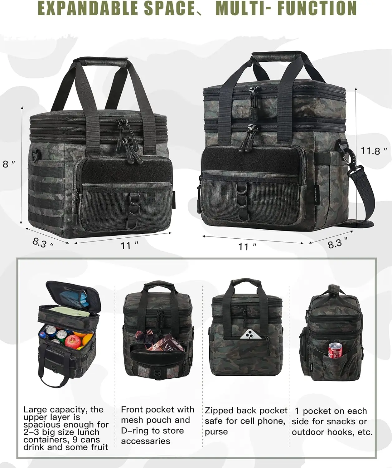 - 【Large Capacity & Multi-Function】JOYHILL giant grownup lunch field sized in 8.3″ x 11″ x 11.8″ (L*W*H) ,18L capability with a simple accessible extensive opening. 5L higher layer for a giant lunch field or snacks; 13L backside layer is roomy for 2-3 giant dimension lunch containers, 9 cans of drinks and some fruits. 4 outer multi-function pockets are for tissue, cutlery, telephones or small gadgets. Expandable design can save area when not in use. Various colours add choices for out of doors work, tenting, picnic, seaside, and so on.