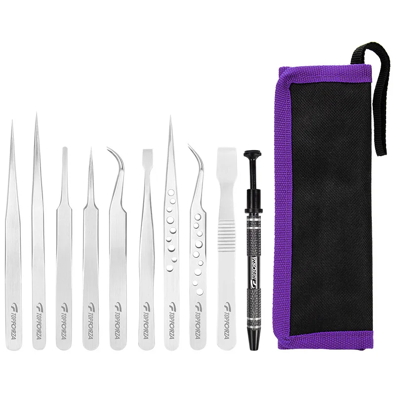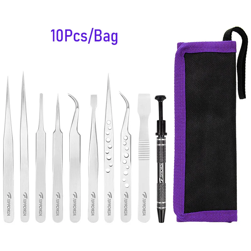 10Pcs/Bag Stainless Steel Tweezers Set Precision Curved Straight Repair Tools Professional Maintenance Industrial Tweezers