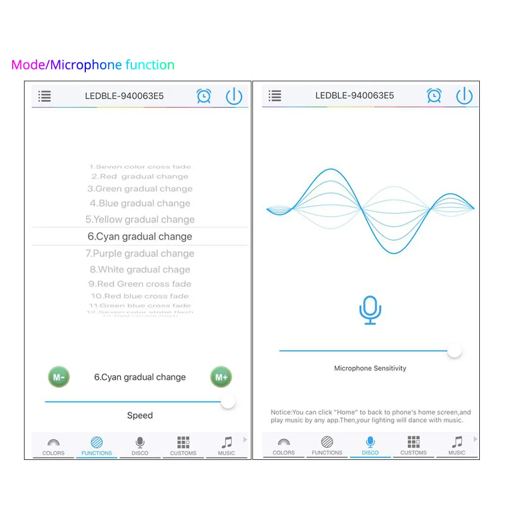 The APP will learn the music information in your cellphone, and the led gentle will change colour or flashing with melody.