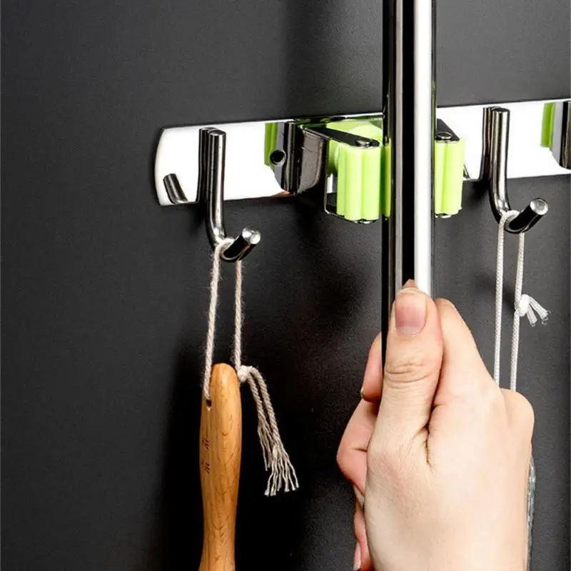 Home Uncategorized Mop and Broom Holder Wall Mount Organizer Storage Tool Racks Stainless Steel Heavy Duty Hooks Self Adhesive Home Kitchen Garden