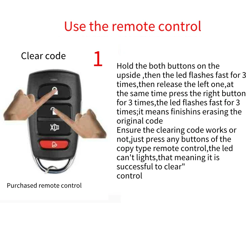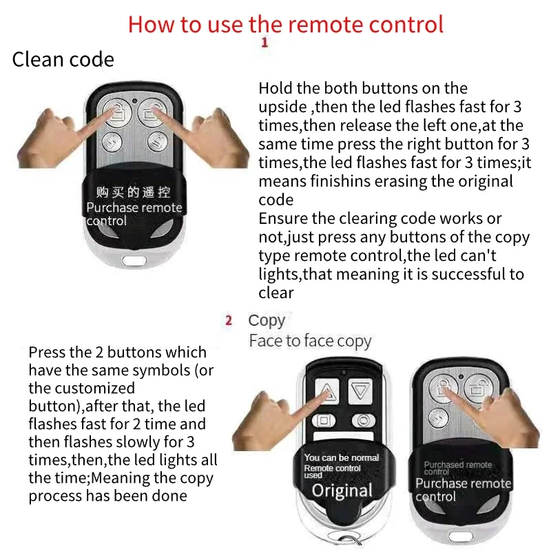 One hand retains the unique distant controller, whereas one other retains the copy distant management, the 2 distant controls needs to be positioned as carefully as attainable (the best scenario is to place the 2 distant controls on the desktop facet by facet with zero distance), respectively press down the copy button, when the LED indicator gentle flashes shortly after three flashes, this copy is profitable, different key working strategies are the identical. Some distant management has a smaller transmitting energy, so the unique distant management needs to be positioned again to the copy distant management to be operated. For the presence of noise, it ought to keep away from interference to function, If the copy isn’t profitable, it ought to recopy after clearing code.( Attention:Your authentic distant management should have the ability to work and the identical as our distant management frequency
