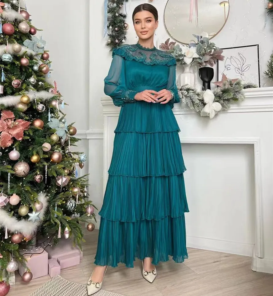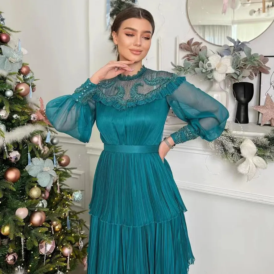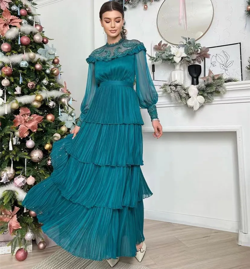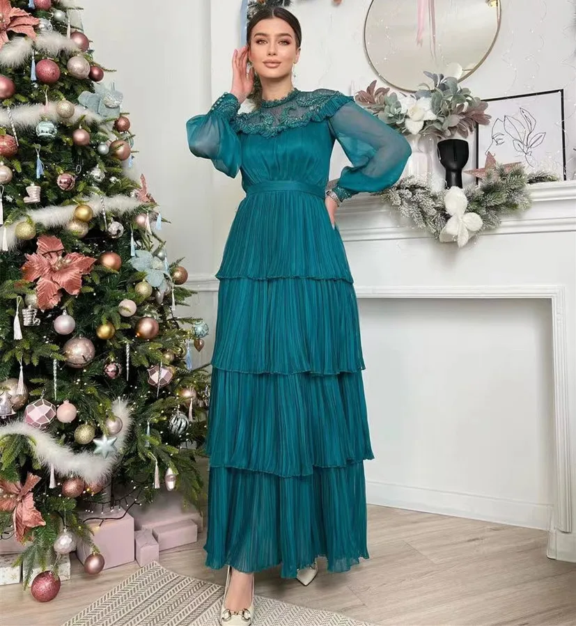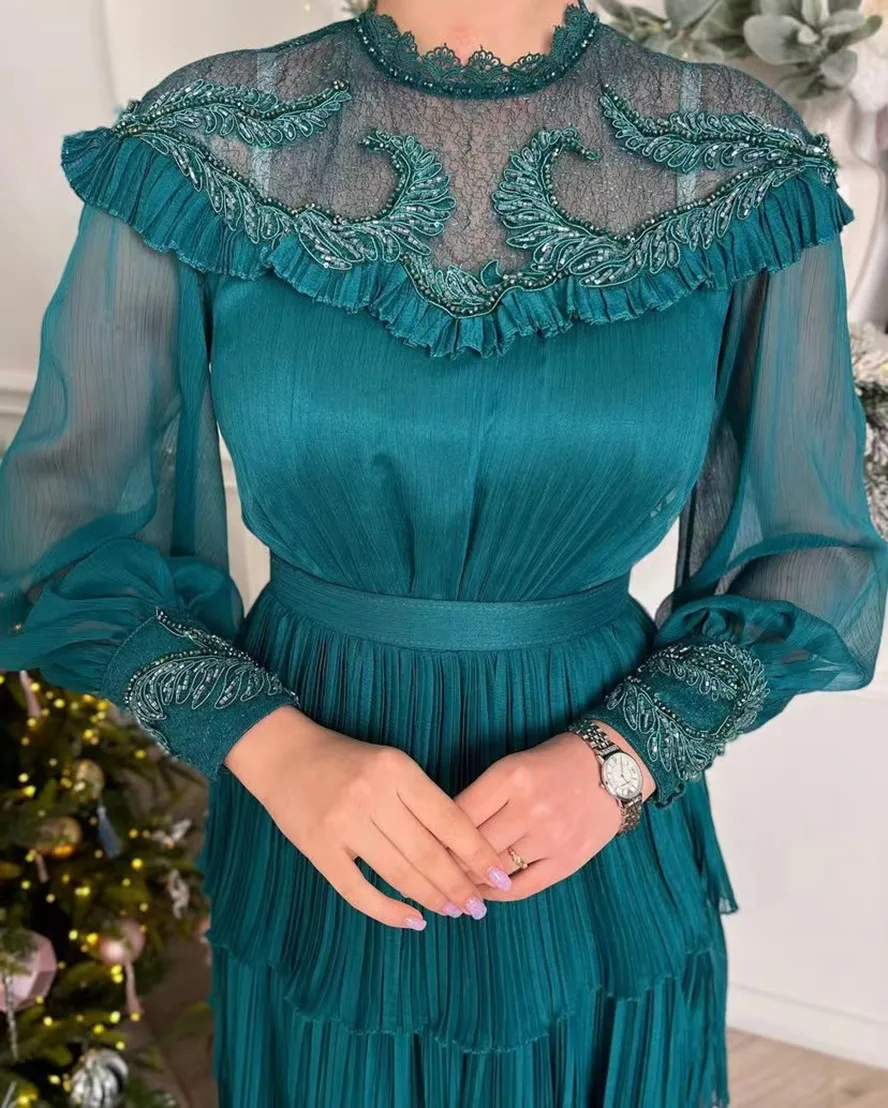 Uncategorized Tiered A Line Ruched Prom Dresses High Collar Beaded Applique Long Sleeves Special Occasion Dress Zipper Back Evening Party Gown affiliatedstore - March 17, 2024 0 Price: [price_with_discount]
