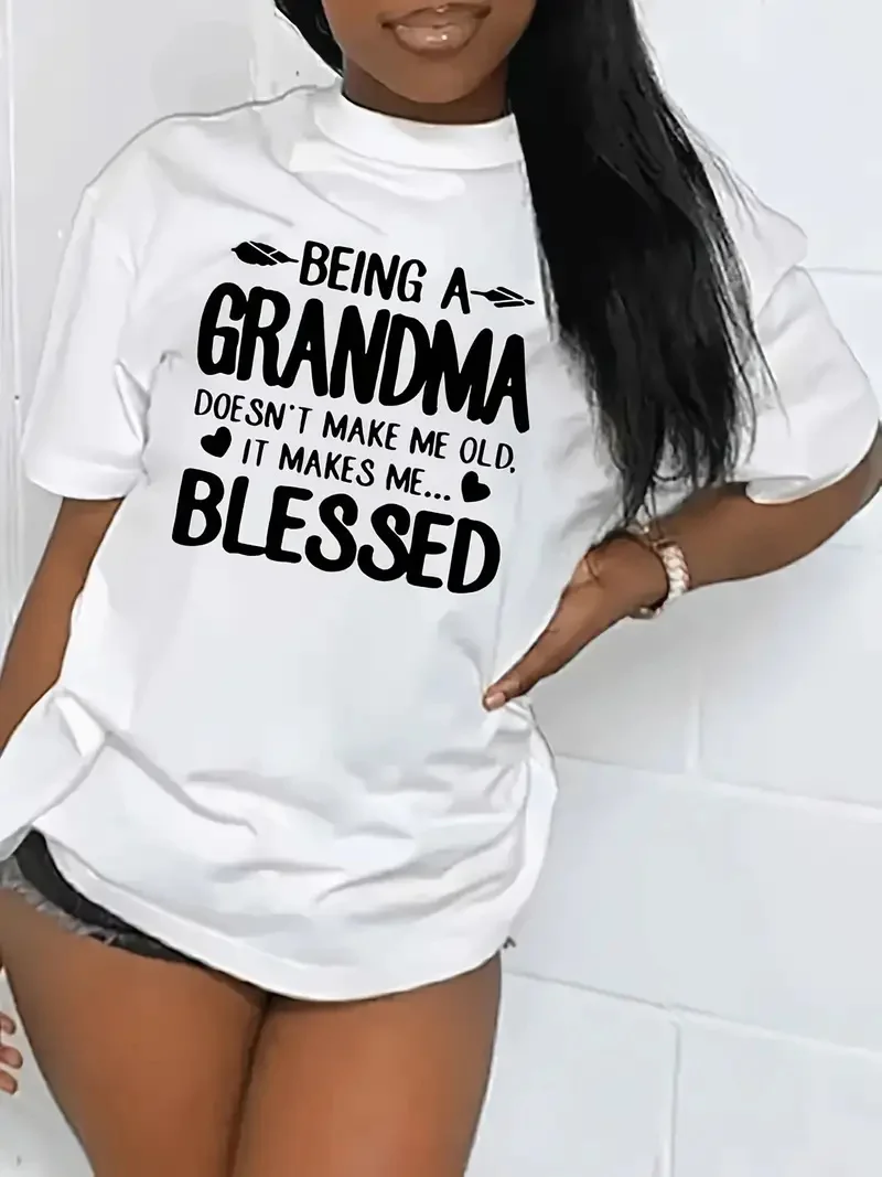 Blessed Grandma Print T-Shirt, Short Sleeve Crew Neck Casual Top For Spring & Summer, Women’s Clothing