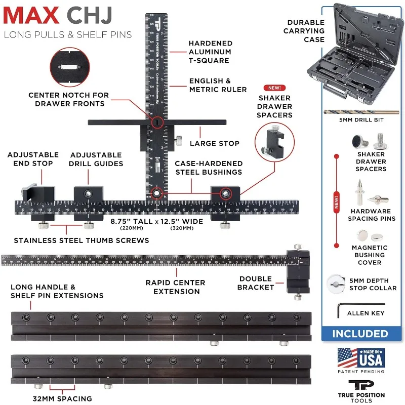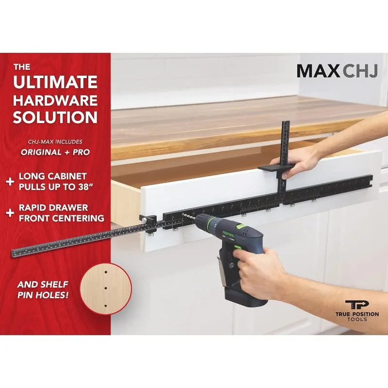 𝗧𝗛𝗘 𝗠𝗢𝗦𝗧 𝗩𝗘𝗥𝗦𝗔𝗧𝗜𝗟𝗘 𝗖𝗔𝗕𝗜𝗡𝗘𝗧 𝗛𝗔𝗥𝗗𝗪𝗔𝗥𝗘 𝗝𝗜𝗚 – CHJ-MAX precisely installs cupboard knobs and pulls of just about any size, and drills 32mm shelf pin holes. Works on even the longest cupboard door stile and rails, together with shaker doorways and recessed drawer fronts. Designed for drawer fronts as much as 42″ broad and {hardware} as much as 38″ middle to middle. Includes TP-CHJ, Long Pull & Shelf Pin Extensions, Rapid Center Extension, 5mm drill bit, depth cease and arduous carrying case.