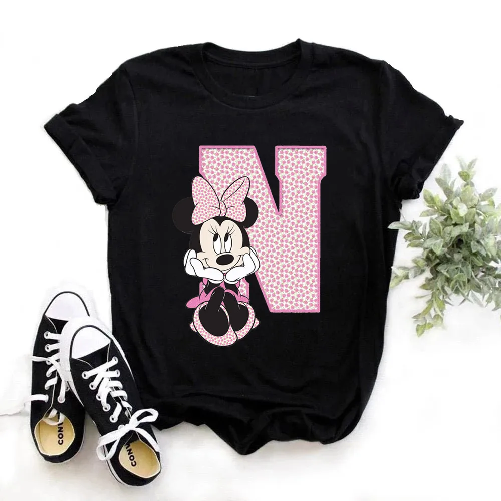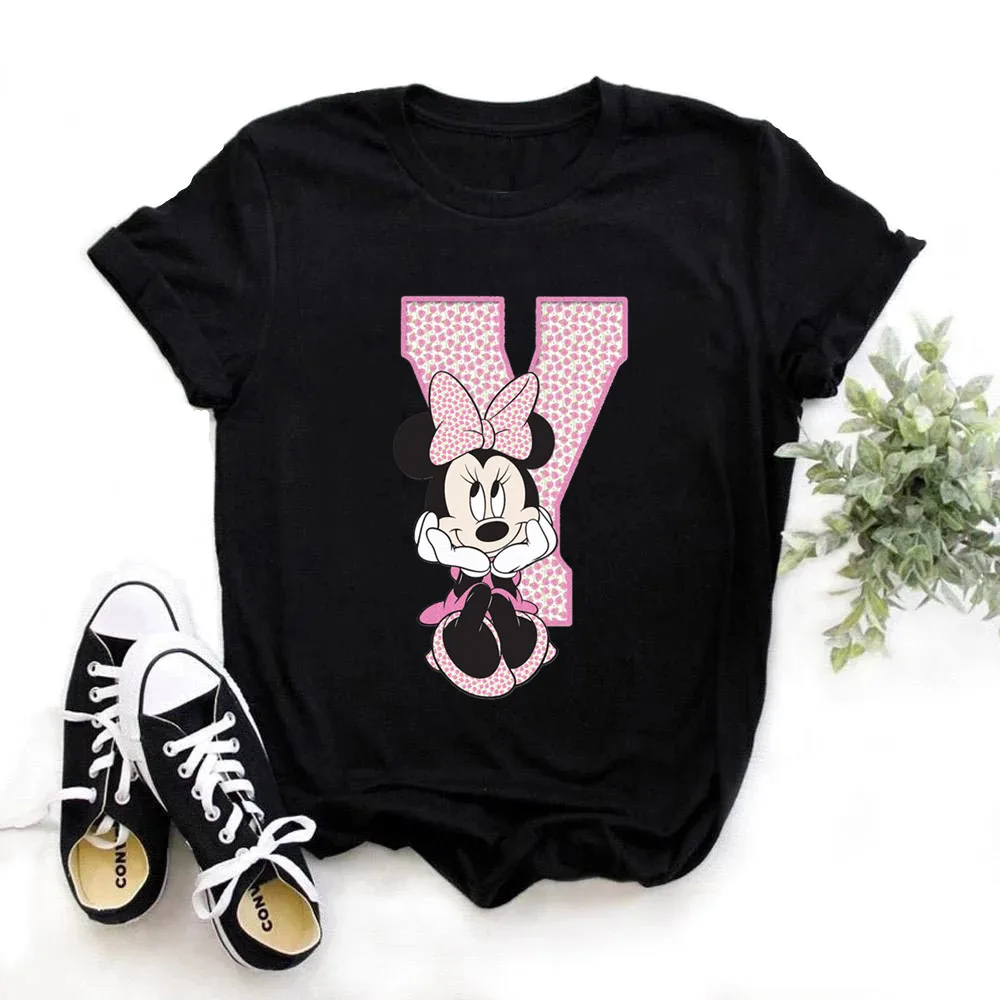 Disney Minnie Mouse T-shirt Female Funny 26 Capital Letters A-Z Print Tshirt Gothic Round Neck Tops Summer Kawaii Tops Women