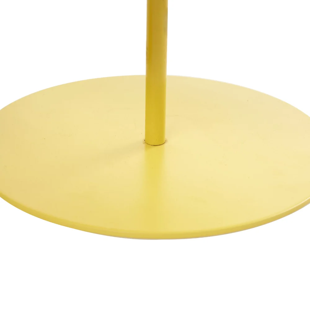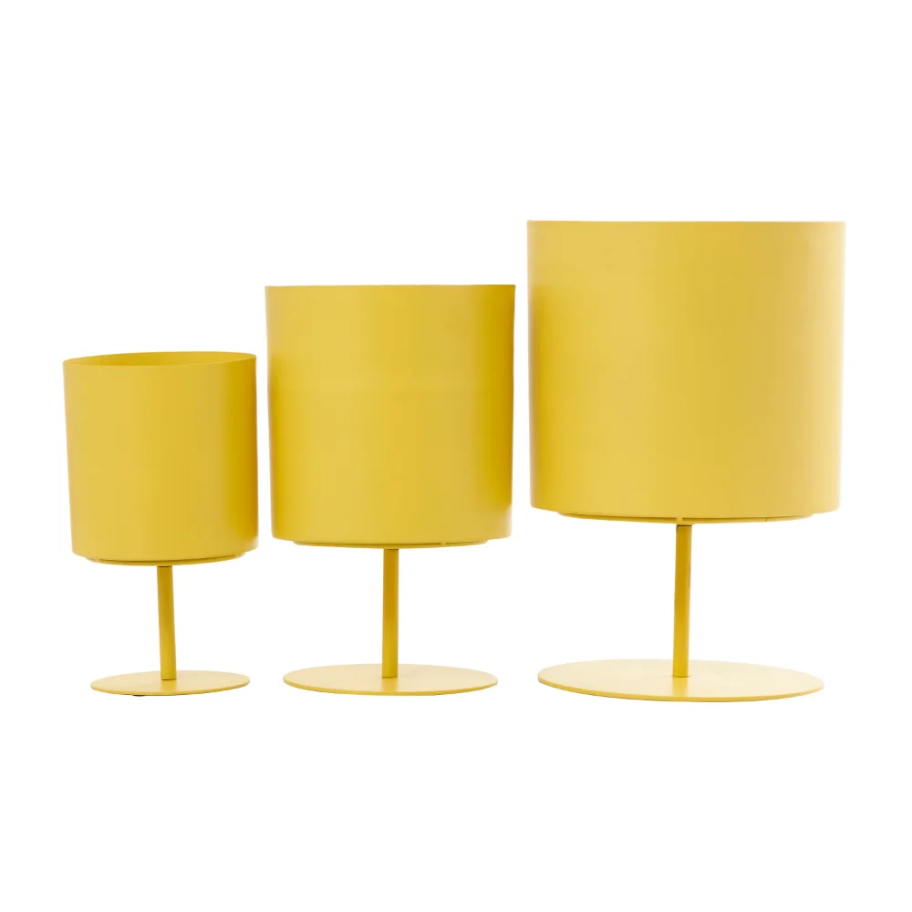 - Metal planters are molded into cylindrical pots, and welded to tapered yellow legs and flat base stands for sturdy help