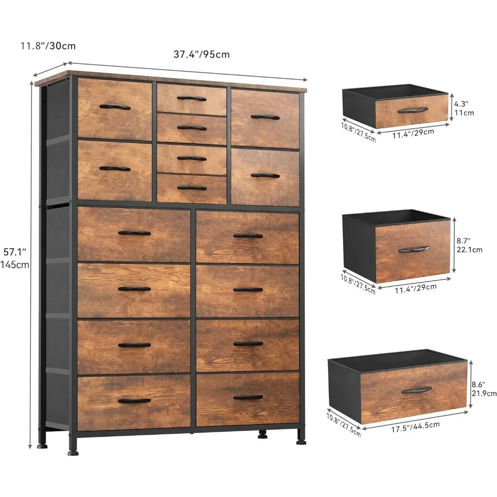- SAFE & EASY USE: Overall dimension: 57.1 “H X 37.4” L X 11.8 “D; 4 Small drawer dimensions: 11.4 “L X 10.8” D X 4.3 “H; 4 Medium drawer dimensions: 11.4 “L X 10.8” D X 8.7 “H; 8 Large drawer dimensions: 17.5 “L X 10.8” D X 8.6 “H; It’s a breeze to assemble the brown dresser for bed room with directions included; Recommended to anchor the drawer dresser to the wall for anti-tipping security