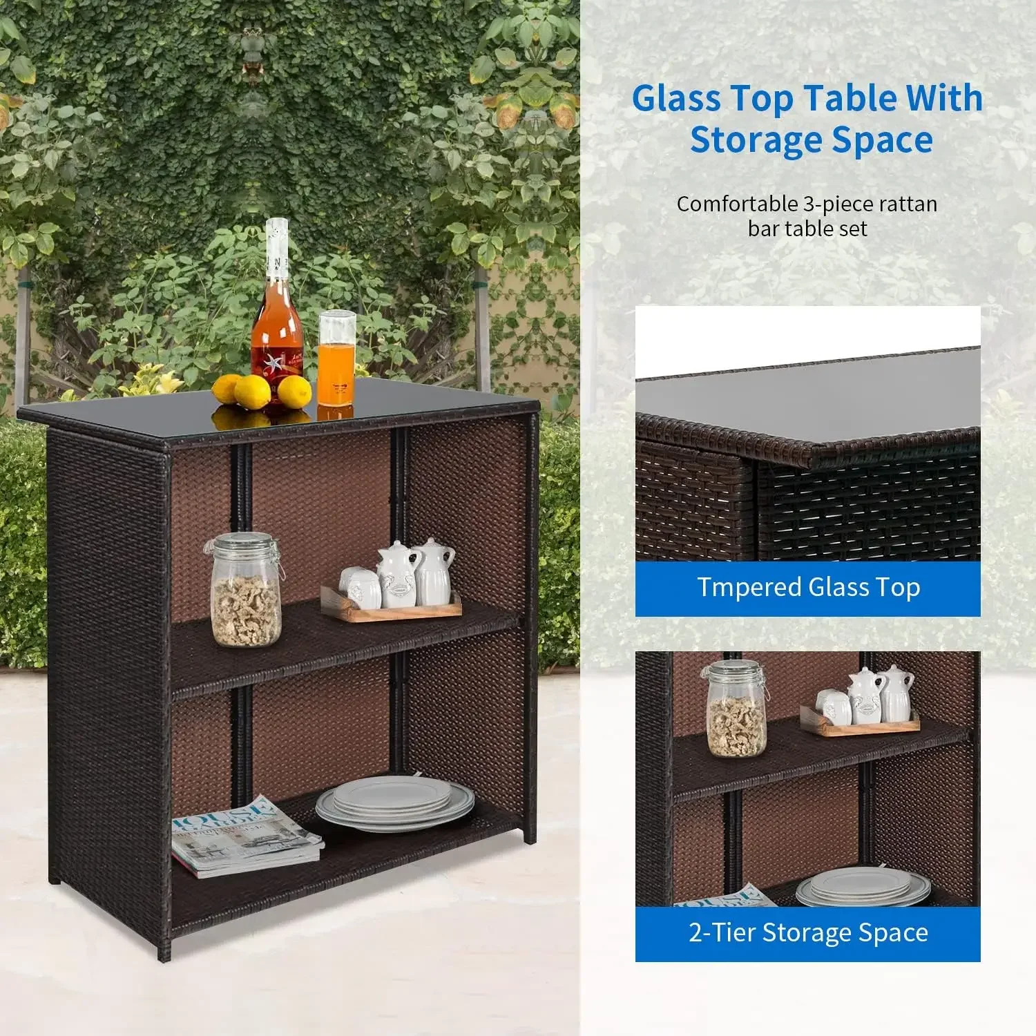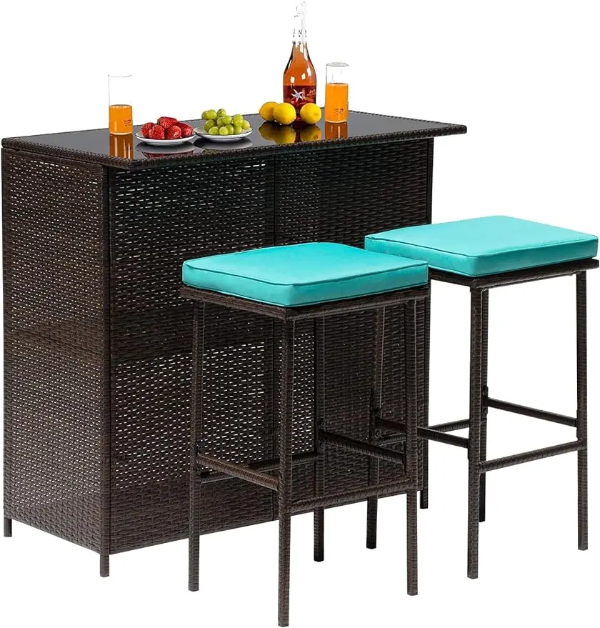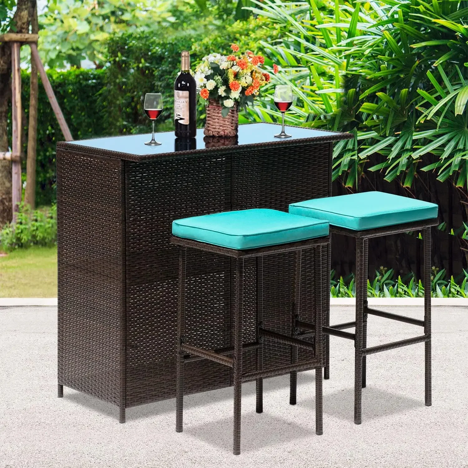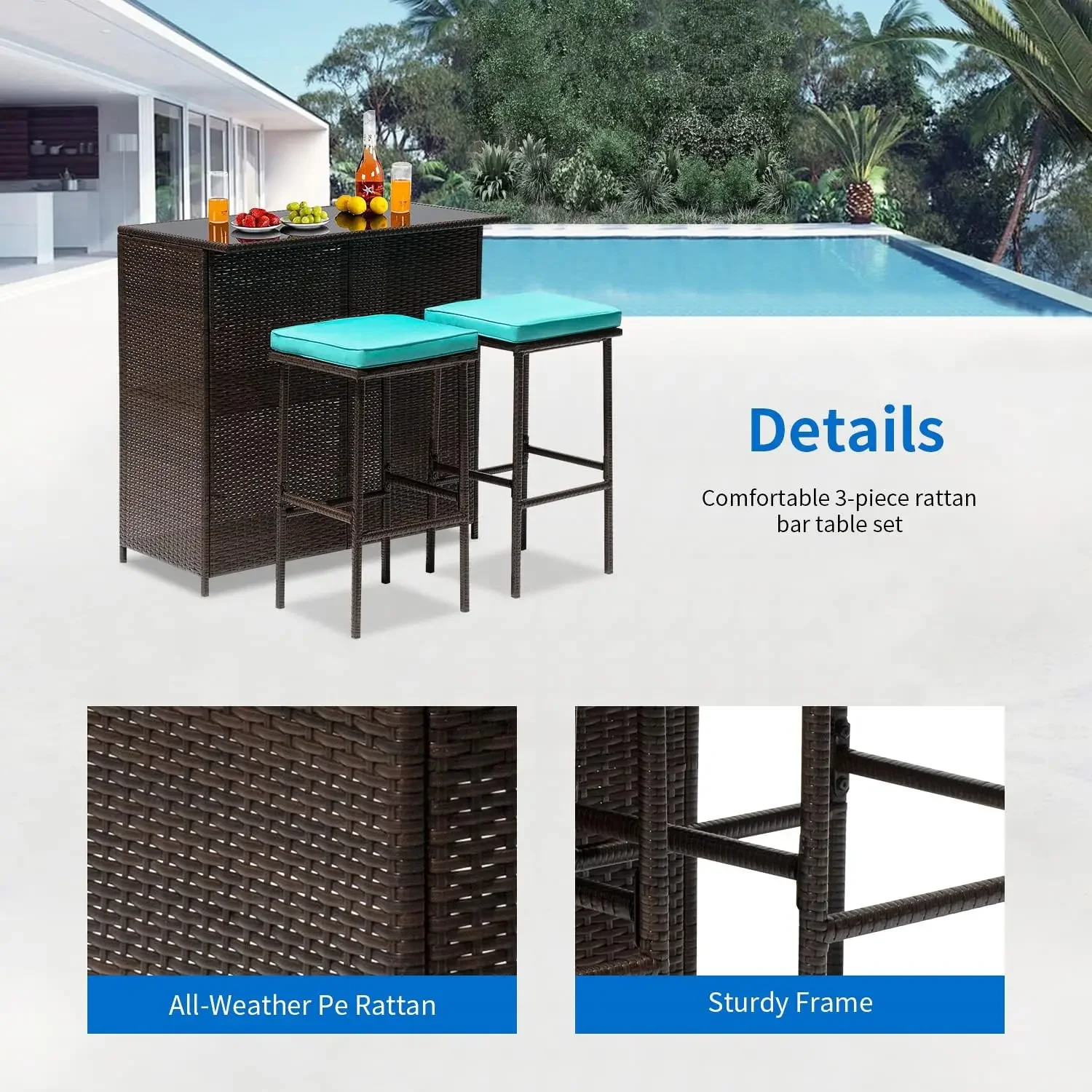 Home Uncategorized 3PCS Patio Bar Set Outdoor Furniture Set Wicker Bistro Set with Two Stools for Patio Backyard Balcony,Blue Cushion