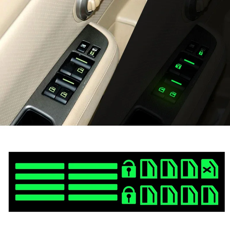 Product title: Car window luminous button sticker Color: luminous inexperienced, luminous orange, luminous blue Applicable objects: automobile window buttons Material: PET Size: about 2.6*10.2cm amount: 1