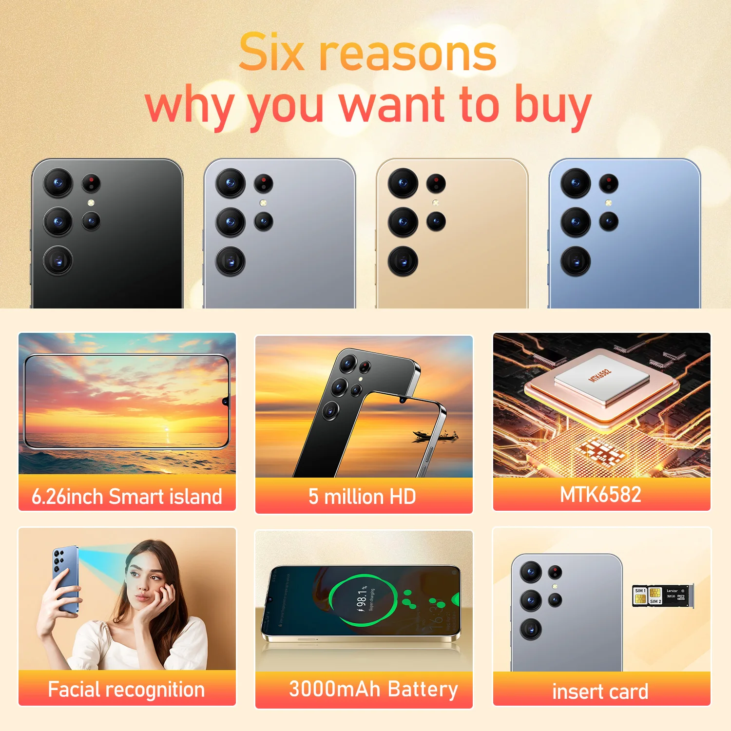 Support good wakeup, face recognition, WiFi + Bt + FM + GPS, Type-C interface, 3.5mm normal headphone jack, Bluetooth, OTG, WAP / MMS / GPRS ,Wifi, GPS, Gravity Sensor, Alarm ,Calendar,Calculator,Audio recorder ,Video recorder, WAP/MMS/GPR, Image viewer,E-Book,World clock…