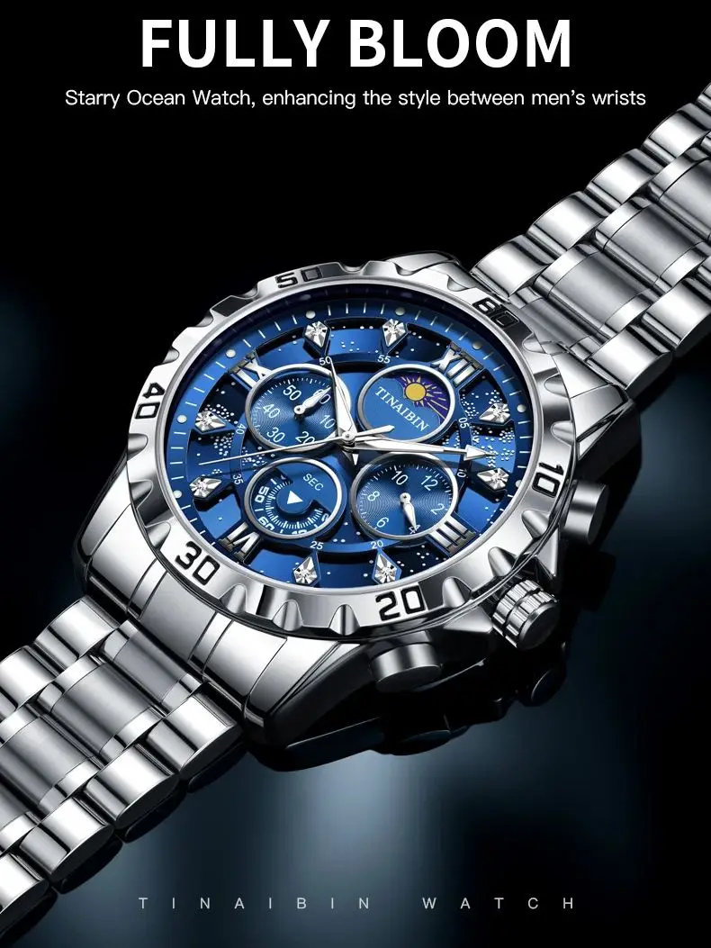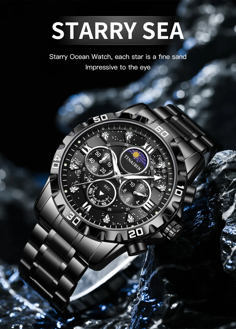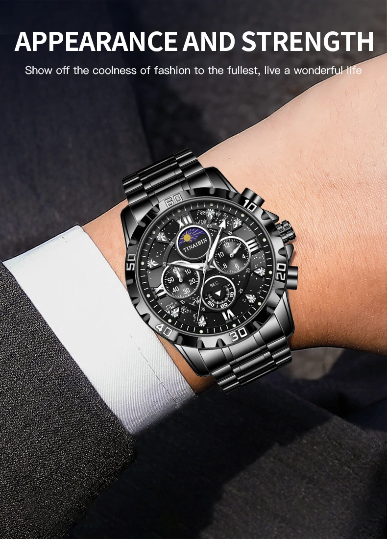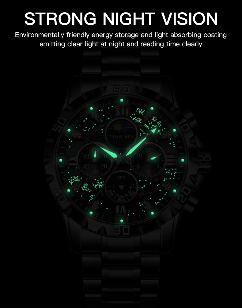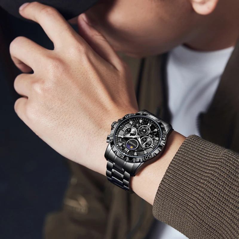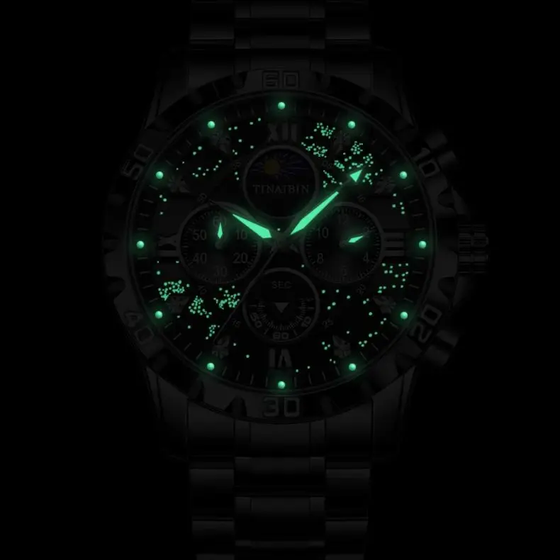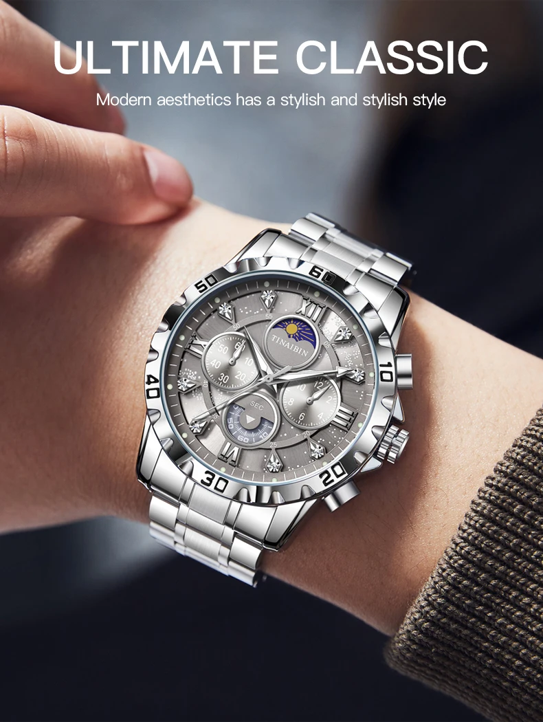 Luxury Sport Men Watch Quartz with Steel Belt Moon Phase Waterproof Luminous Chronograph Multi Function saat erkek kol saati