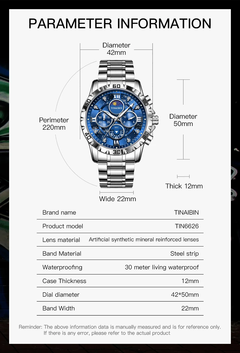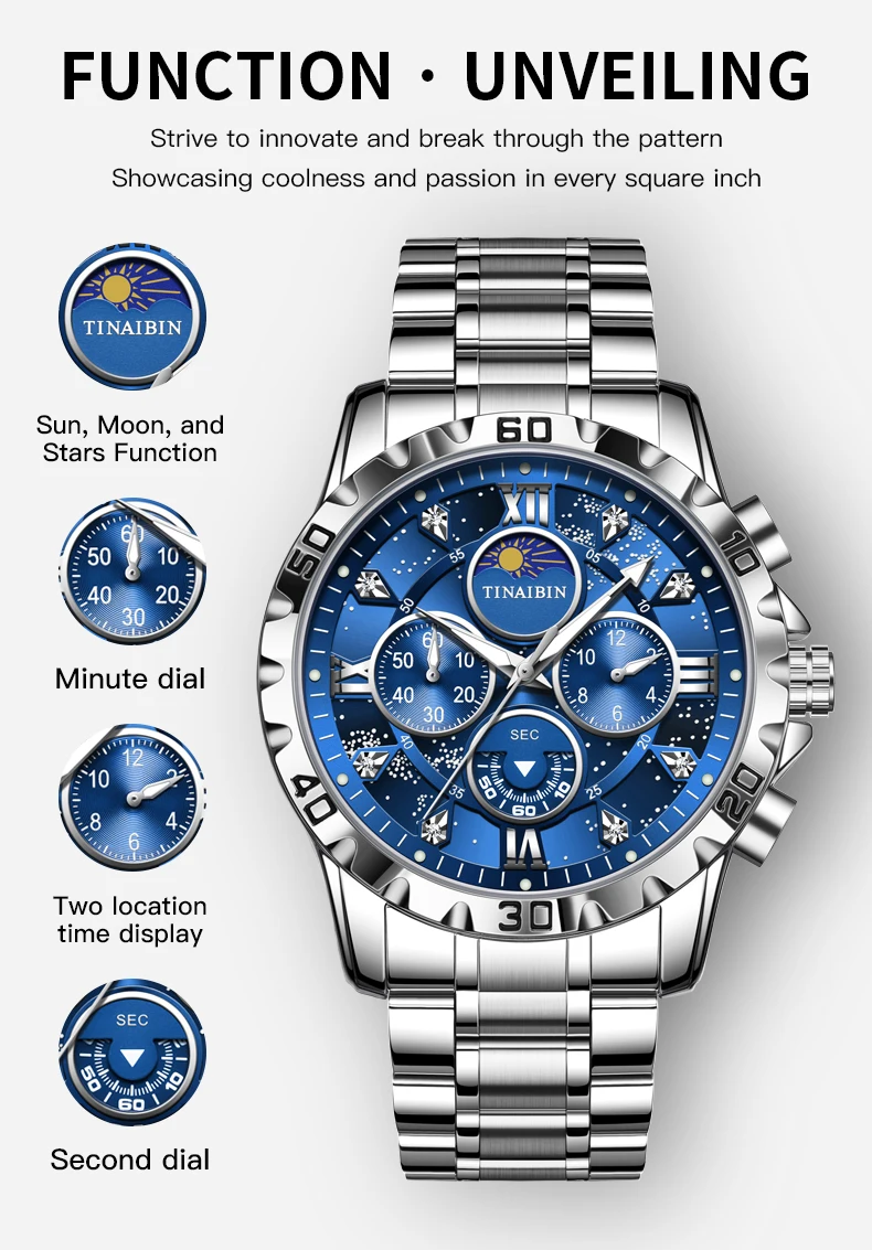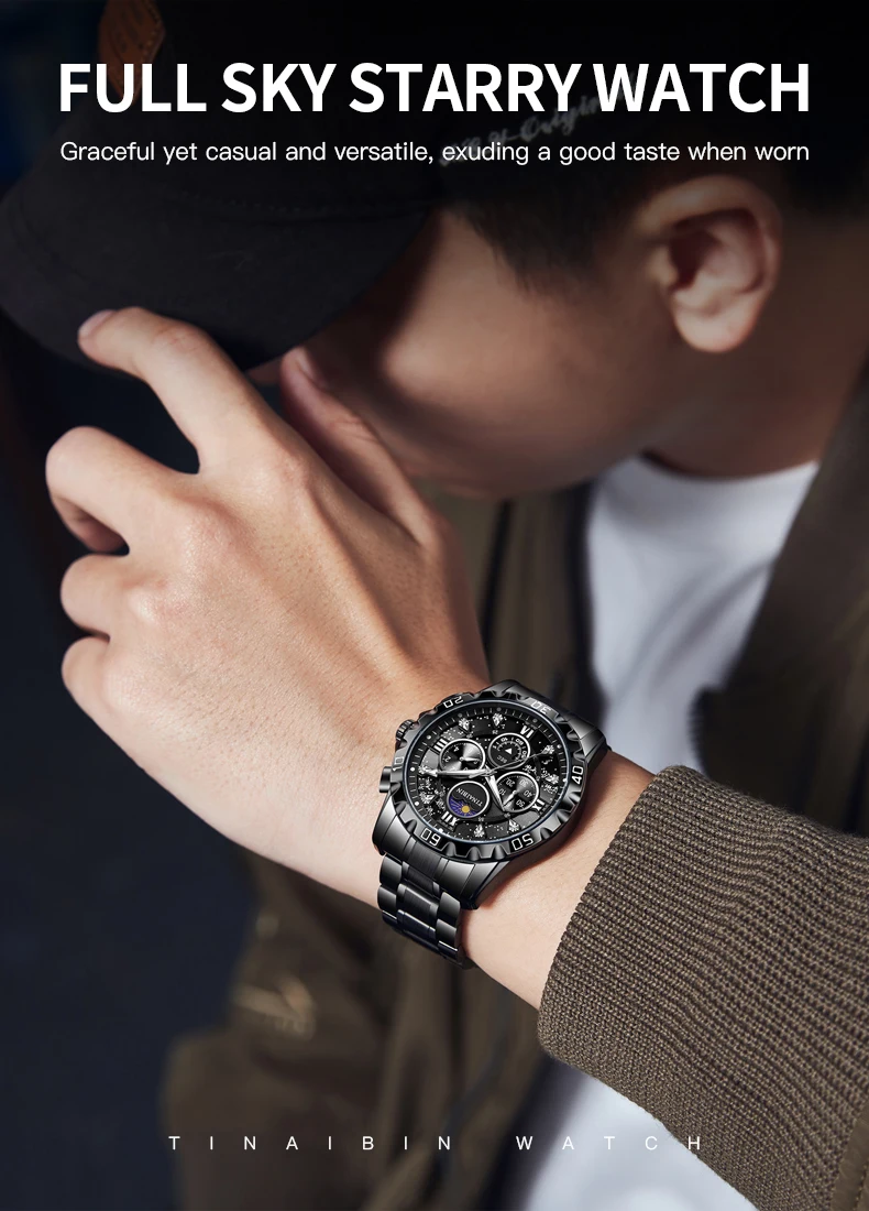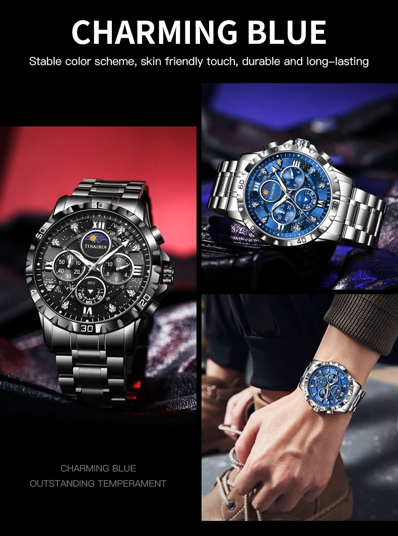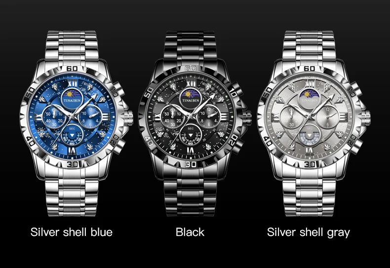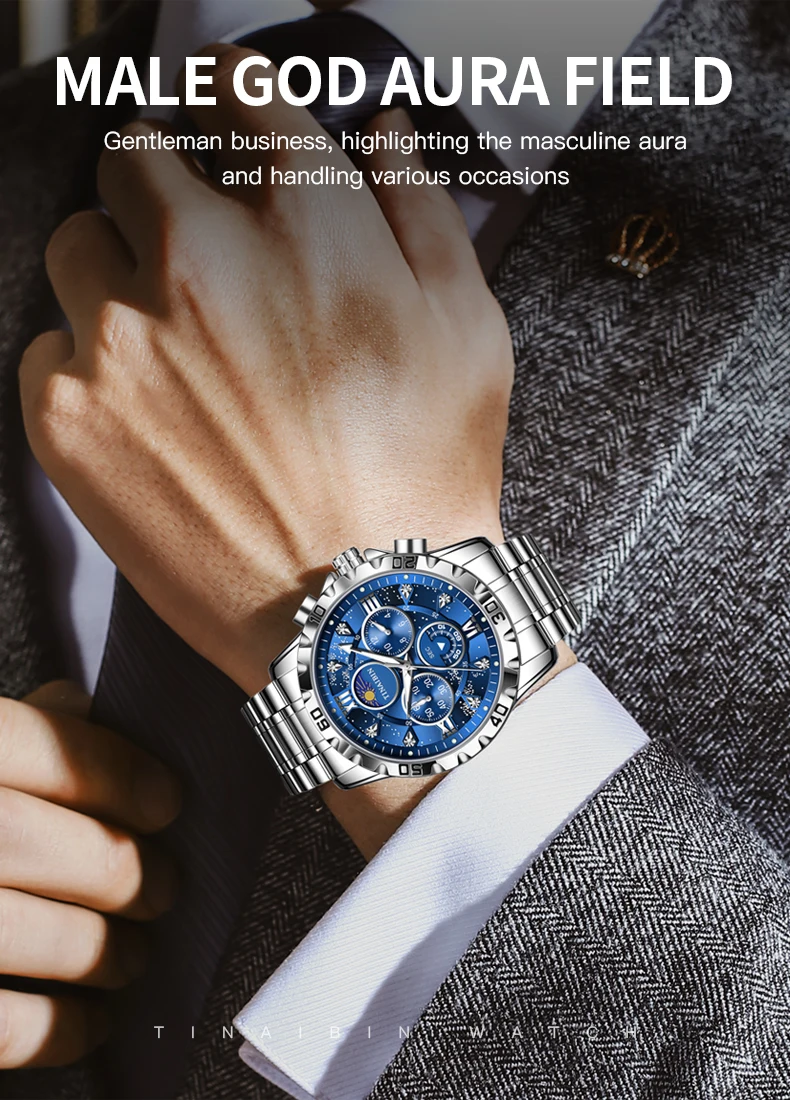 Luxury Sport Men Watch Quartz with Steel Belt Moon Phase Waterproof Luminous Chronograph Multi Function saat erkek kol saati