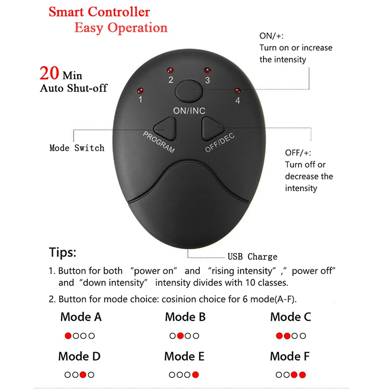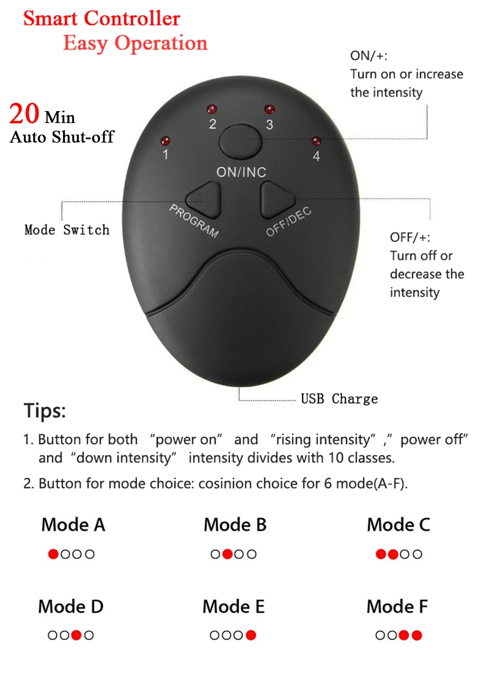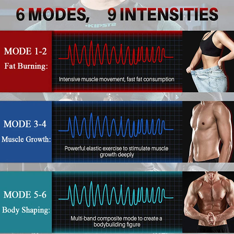 6 Massage Modes & 10 Levels Intensity—This EMS Muscle Stimulator offers 6 train modes to choose—-Mode 1-2 Fat Burning, Mode 3-4 Muscle Growth, Mode 5-6 Body Shaping. Plus 19 ranges depth from warm-up to high-intensity train and eventually to rest.
