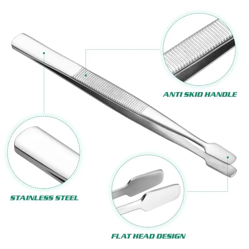 – Flat tip. Widely used for selecting stamps or different delicate objects like beads, jewellery, eyelash, and so on.