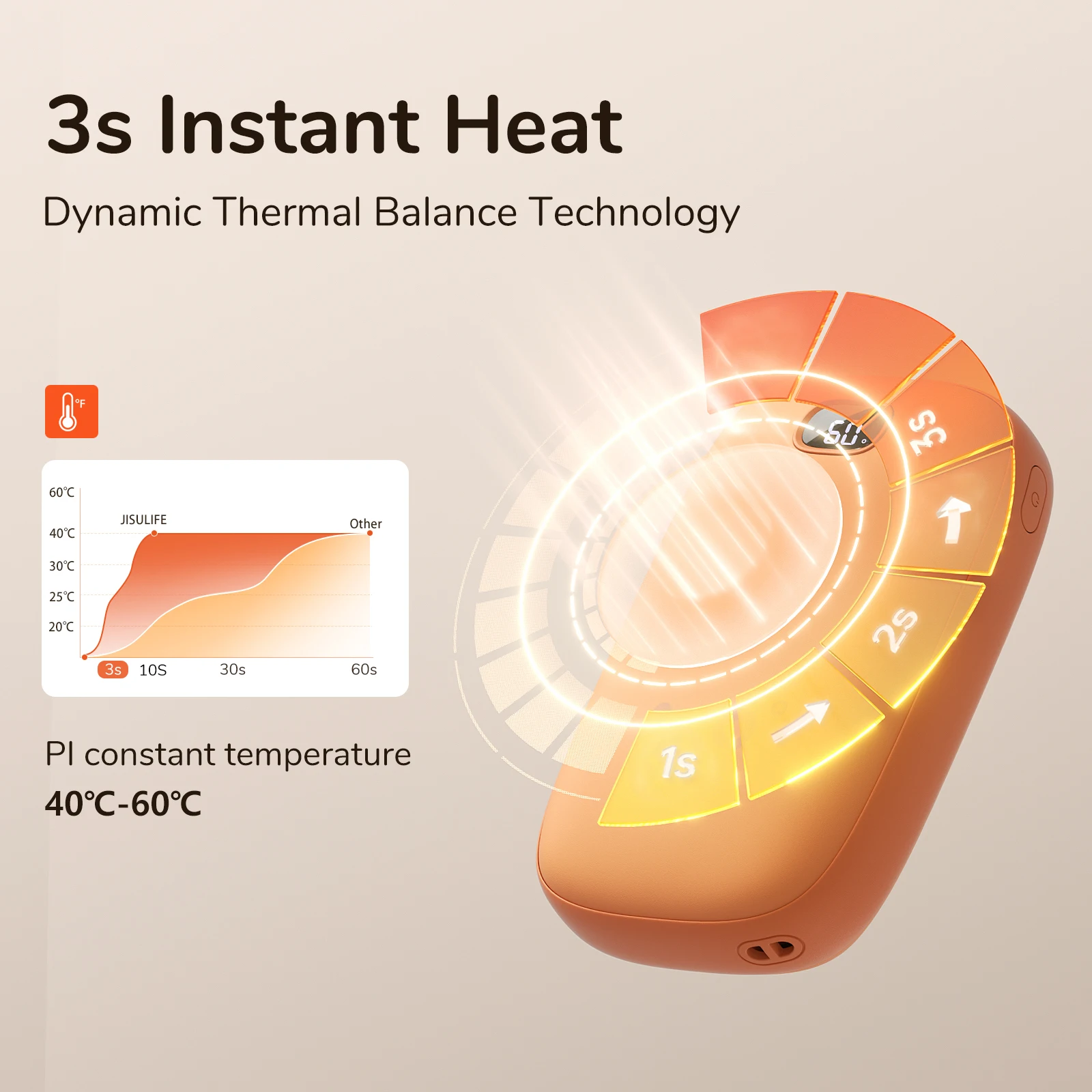 【Instant Warmth & Balanced Thermal Conductivity】JISULIFE rechargeable hand hotter with dynamic warmth stability know-how, fast warmth switch, quickly warm-up in 3 seconds, uniform double-sided heating. 3 ranges of temperatures 104℉ (40℃ )/122℉ (50℃)/140℉ (60℃) at your selection, contracting you a complete winter heat.