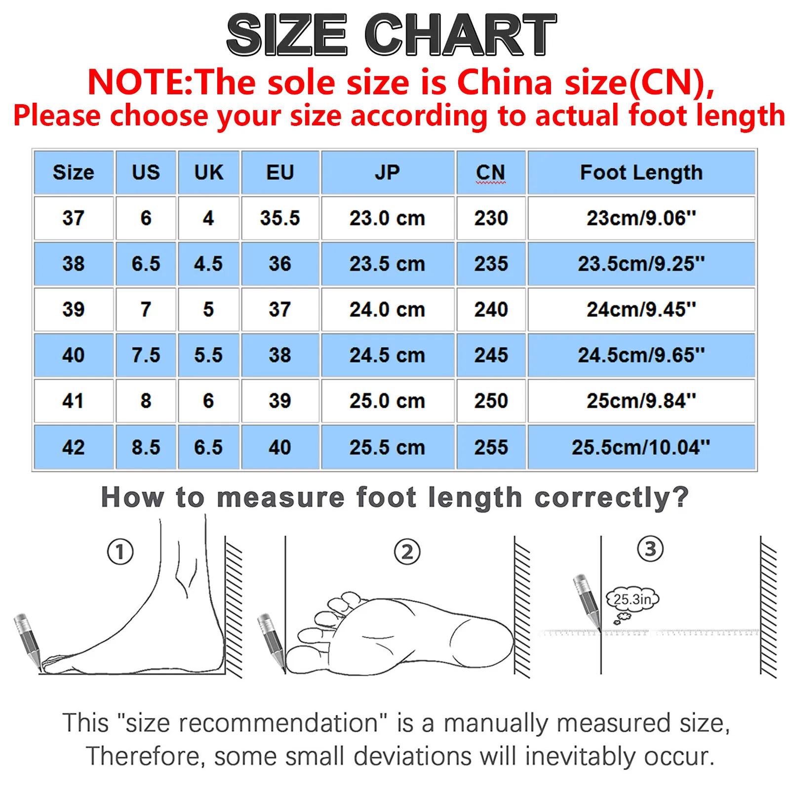 Size:40 | US:7.5 | UK:5.5 | EU:38 | JP:24.5 cm | CN:245 | Foot Length:24.5cm/9.65” |