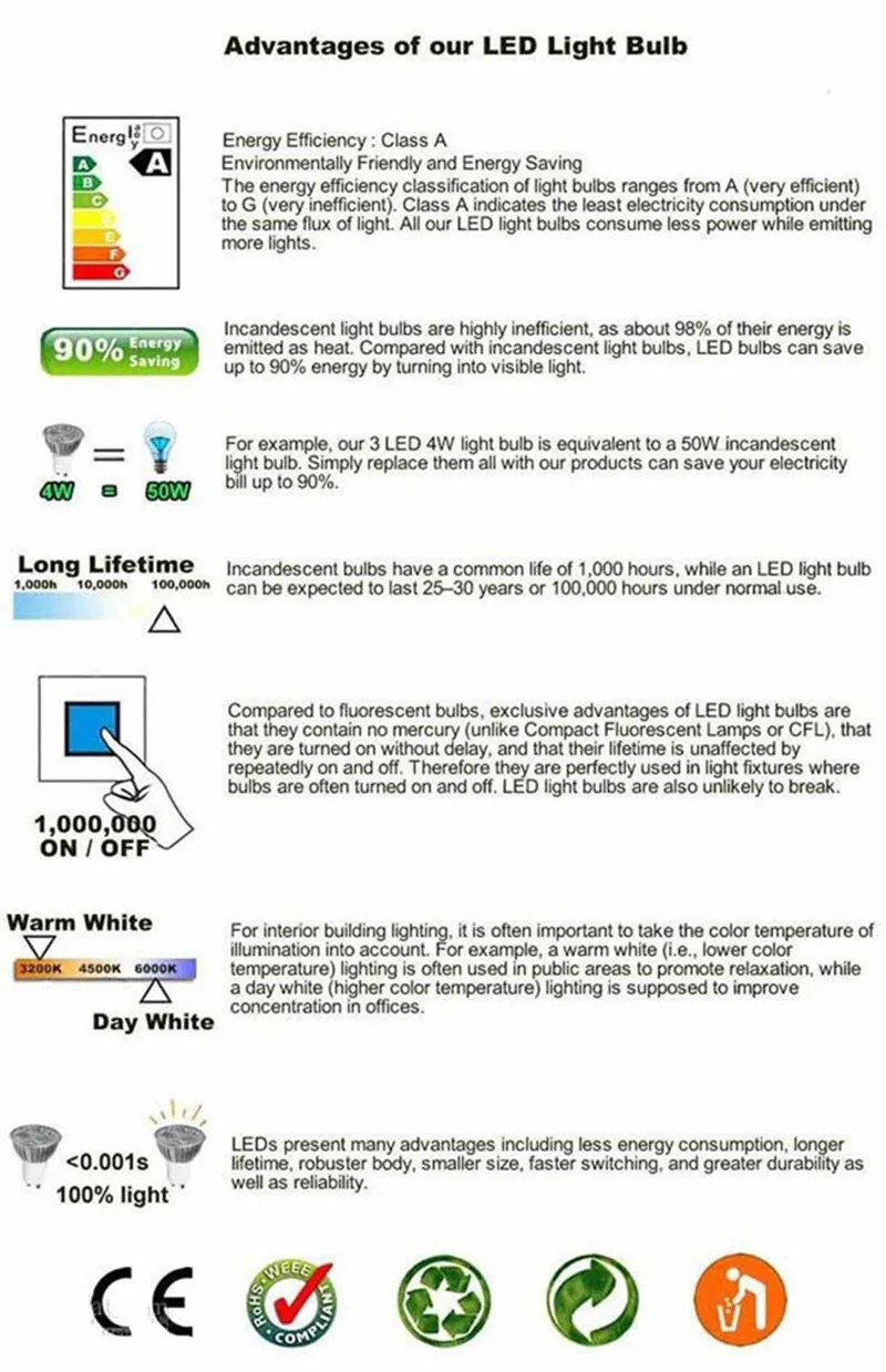 Color: Warm White 3000K; Natural White 4000K; Pure White 6000K