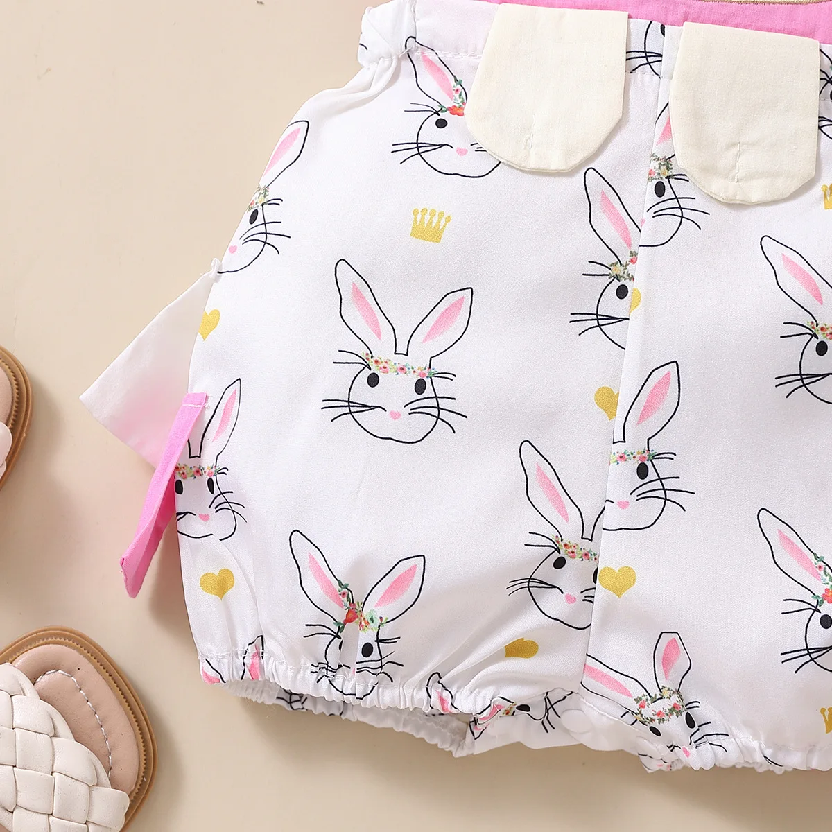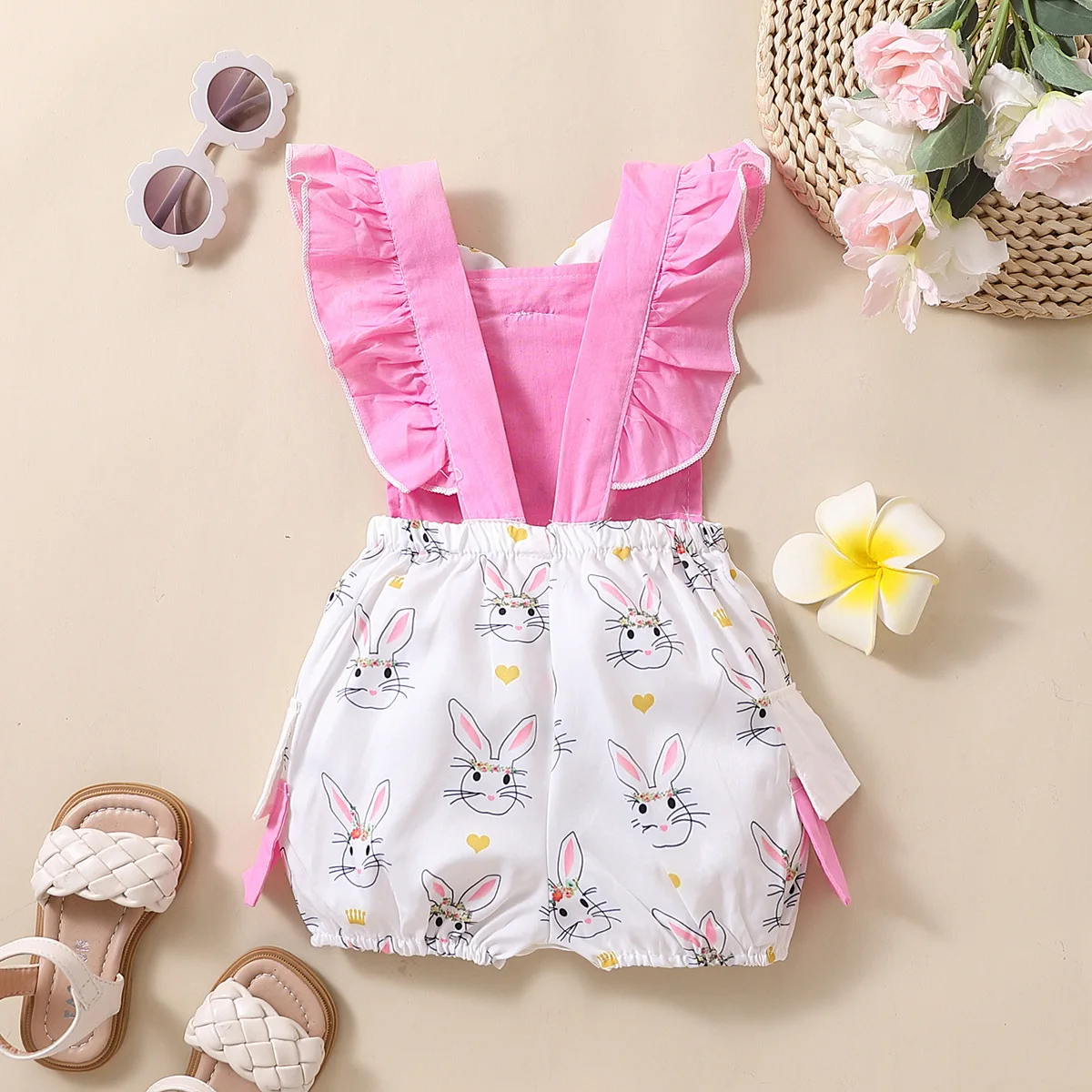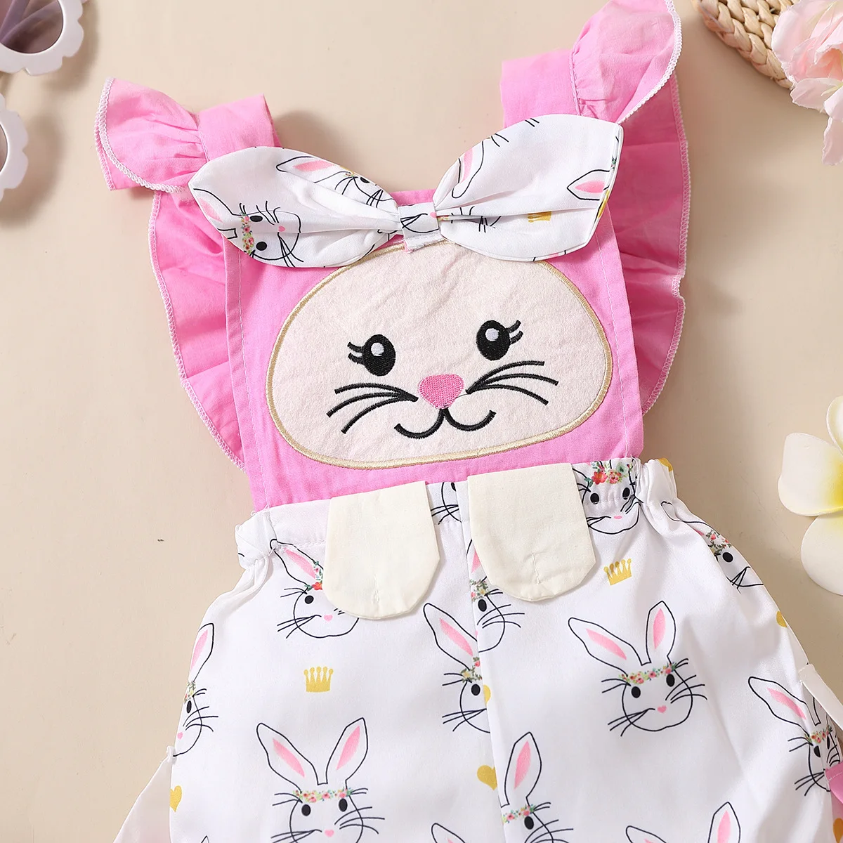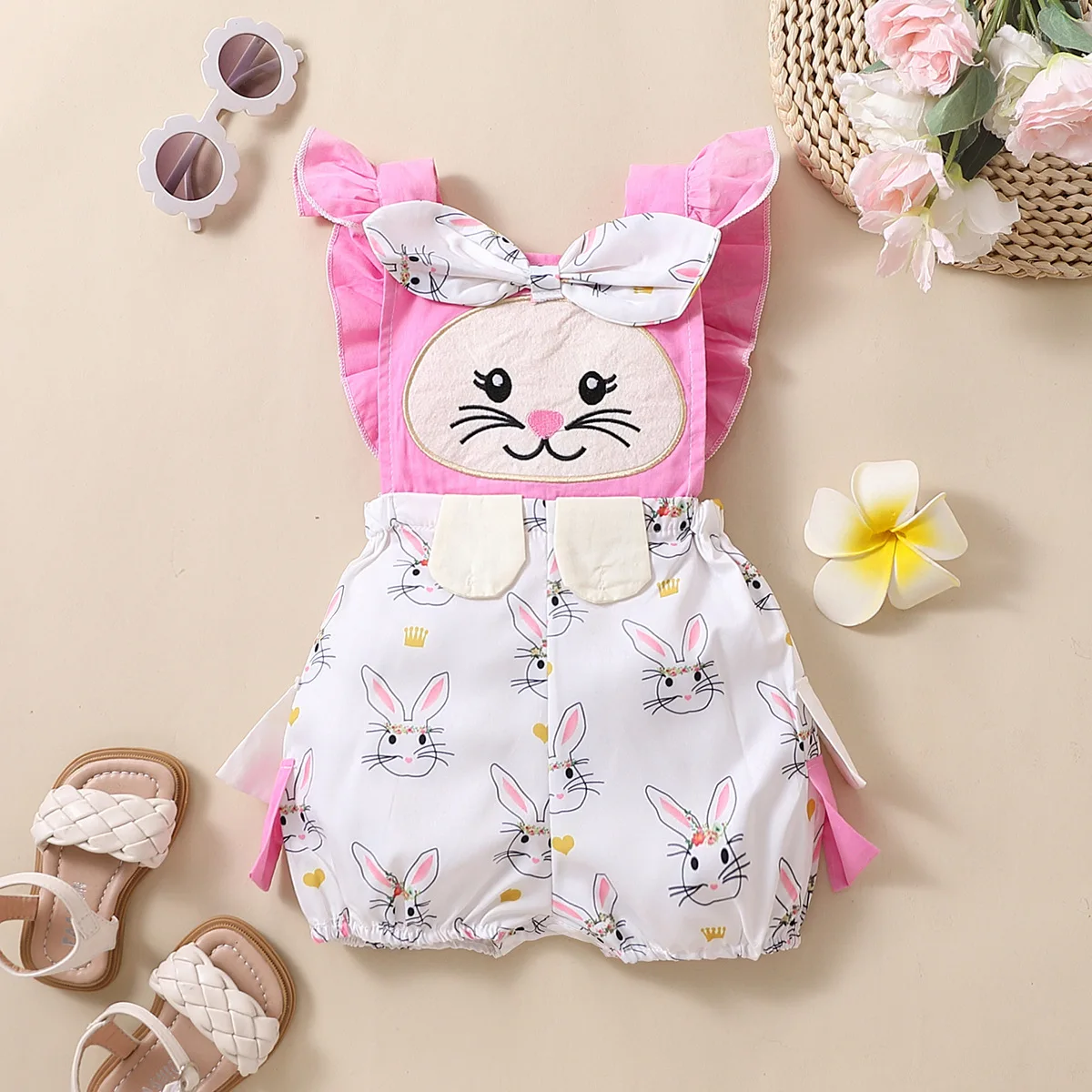 Summer Girls Cute Butterfly Sleeve Stitching Bow Rabbit Pattern One-Piece Kids Cartoon Cute One-Piece Romper Baby Easter Costume