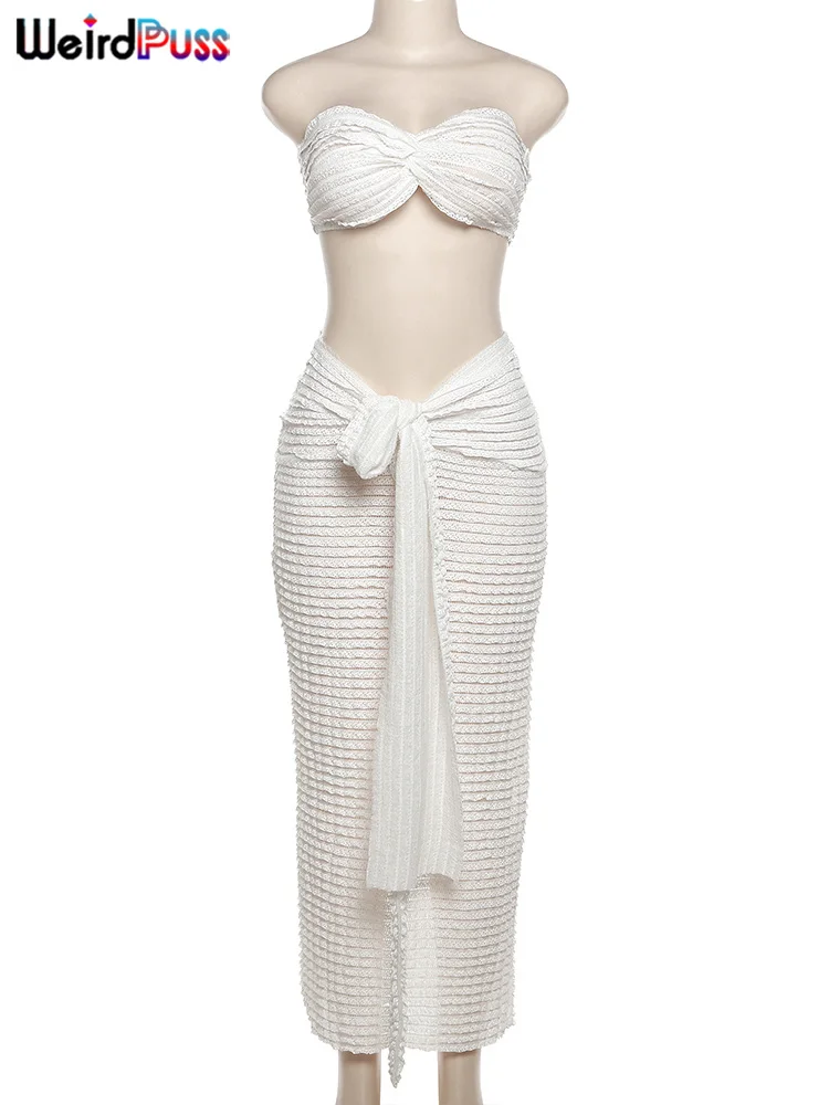 Home Uncategorized Weird Puss Elegant Women 2 Piece Set Midnight Thin Striped Knot Strapless Tops+Bandage Skirts 2023 Vacation Matching Clubwear