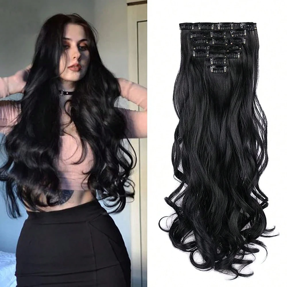 Black Friday 7Pcs 16 Clips 24 Inch Wavy Curly Full Head on Double Weft Hair Extensions Dark Black24 Inch For Women In Daily Use