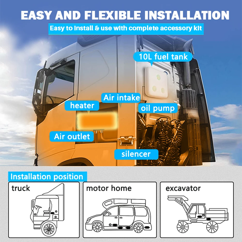 LCD & Remote Control: Our diesel parking heater is provided with an clever LCD monitor and distant management. You can regulate the temperature by distant management or panel, permitting you to heat the automotive earlier than getting into it on the chilly winter morning.