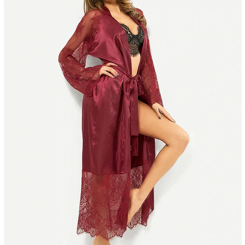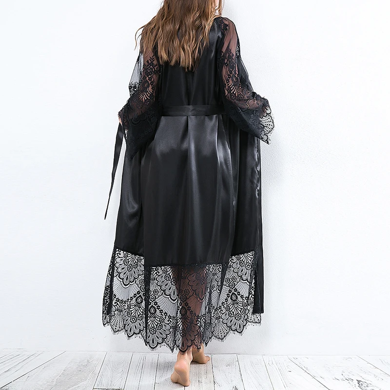 Sexy Women's Robe Night Dress Transparent Lace Long Sleeved Pajamas Embroidered Lace Skirt Hem Erotica Lingerie Sleepwear