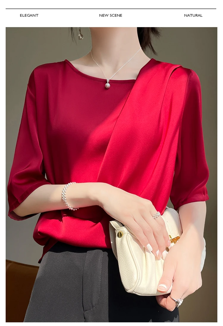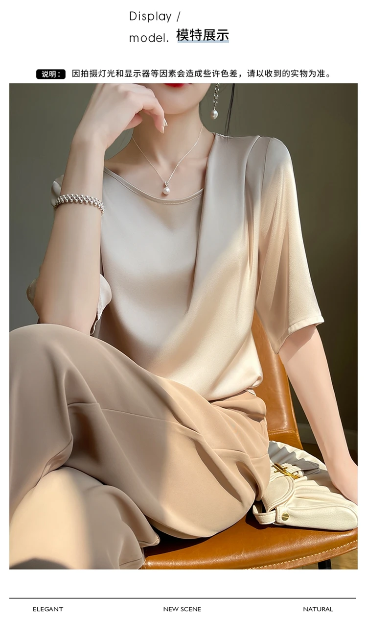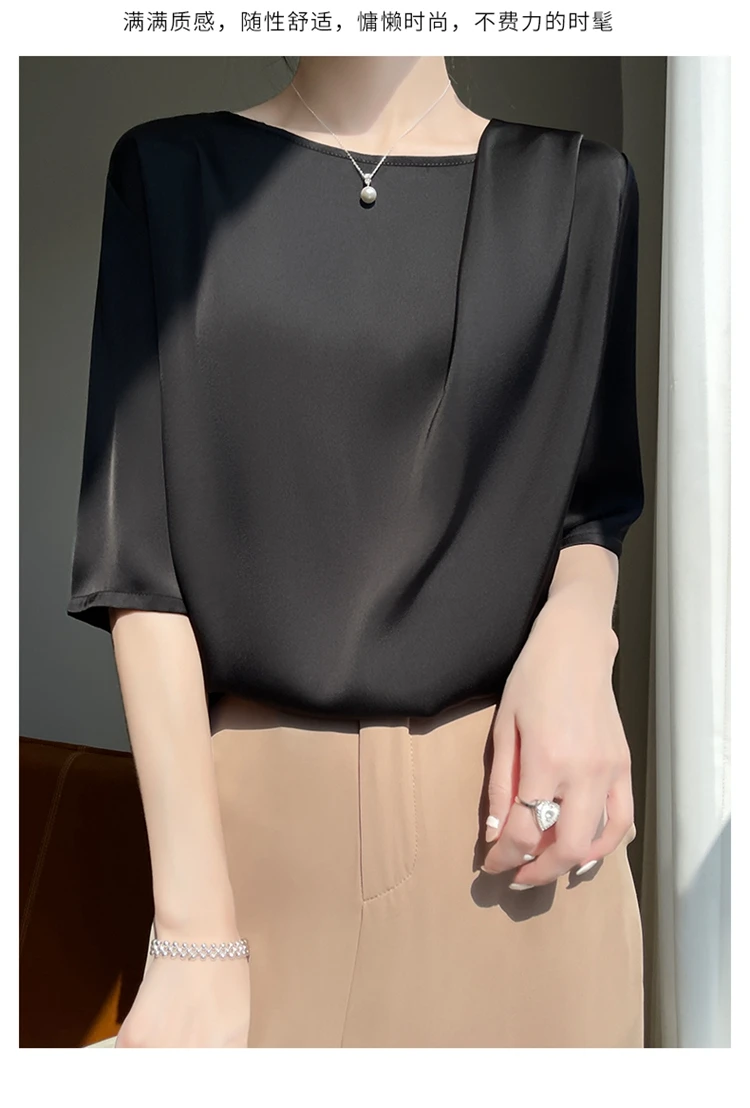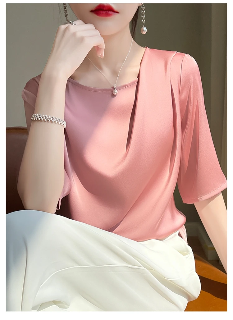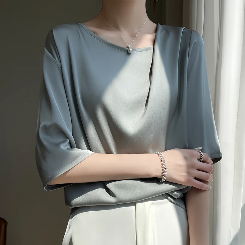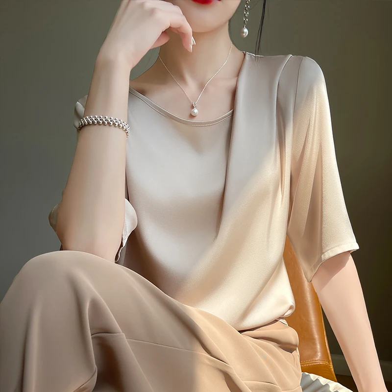 Uncategorized 2023 Summer New Silk T-shirt Round Neck Smooth Pleated Satin Fashionable and Unique Design Feel Loose Half Sleeve Women’s Top affiliatedstore - March 27, 2024 0 Price: [price_with_discount]
