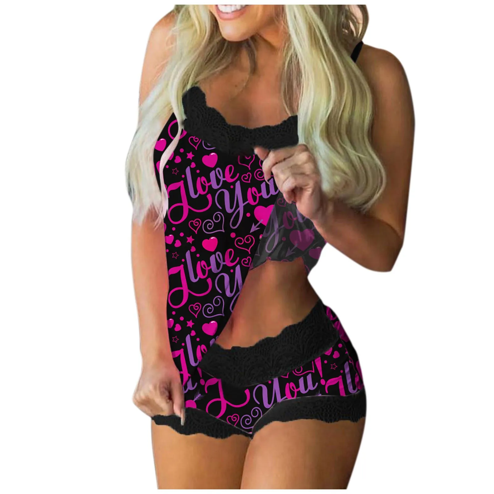 Women Print Pajamas Sleeveless Lace Cami Shorts Lingerie Sleepwear Set