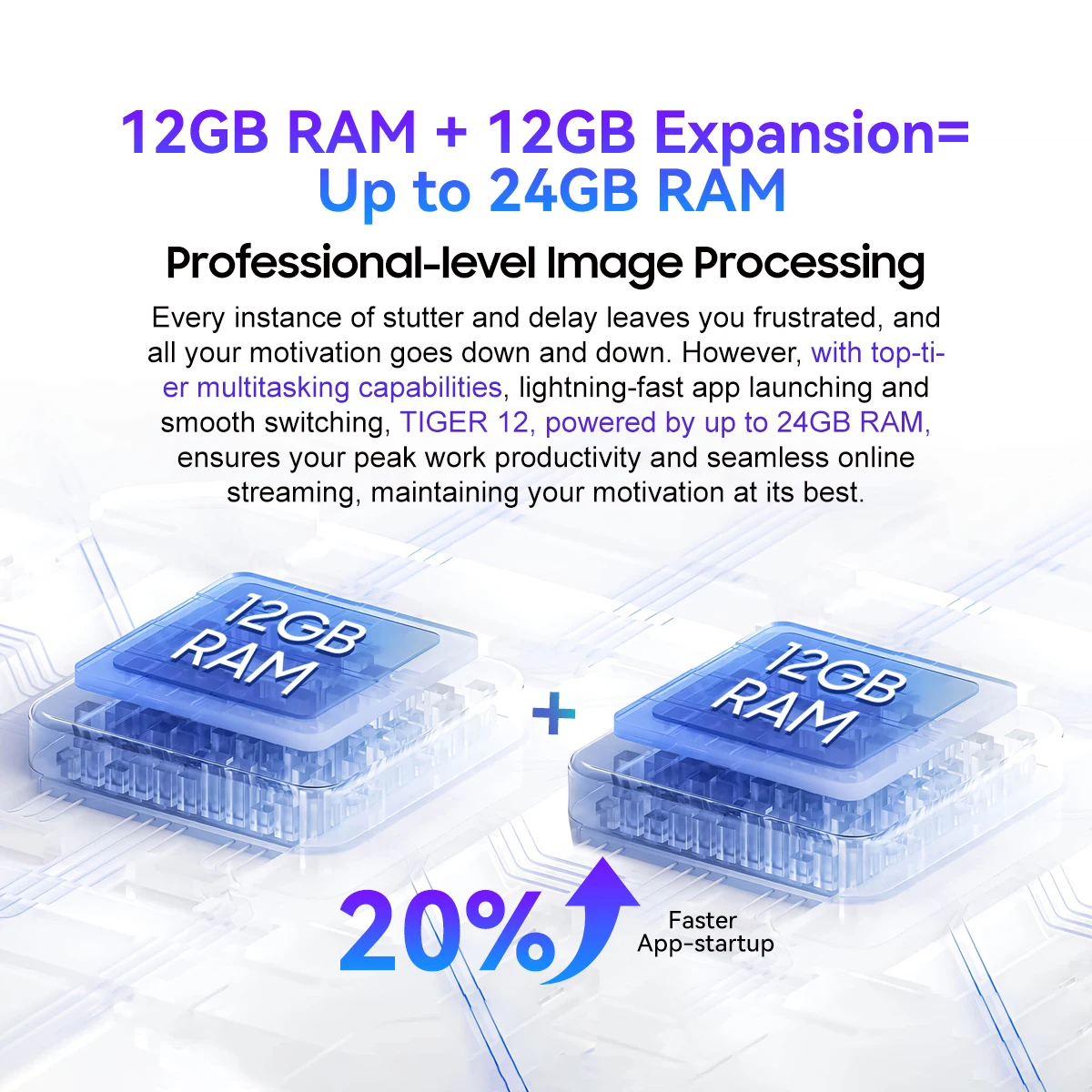 Every occasion of stutter and delay leaves you pissed off, and all of your motivation goes down and down.However, with top-tier multitasking capabilities, lightning-fast app launching and easy switching,TIGER 12, powered by as much as 24GB RAM, ensures your peak work productivityand seamless on-line streaming, sustaining your motivation at its finest.256GB ROM + Up to 1TB TFExpansion