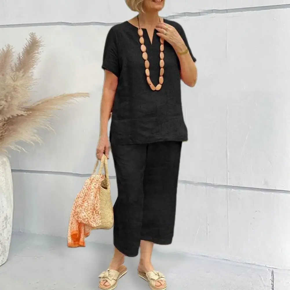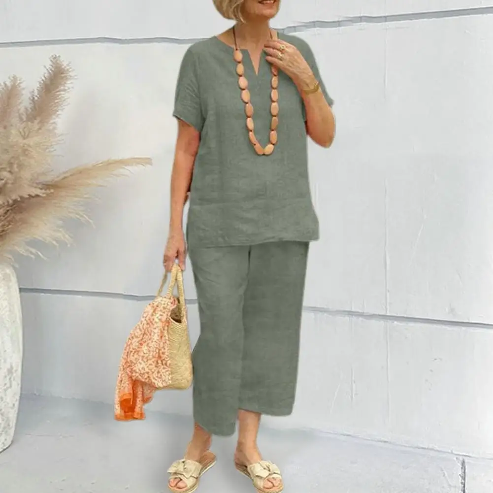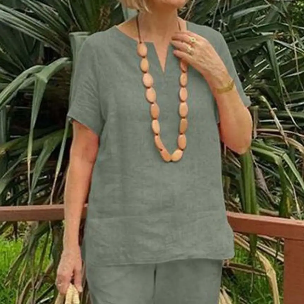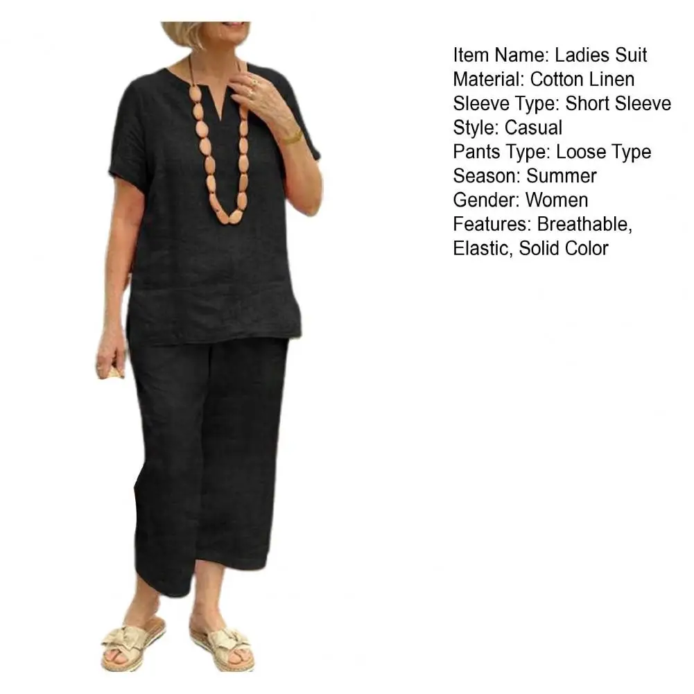 2Pcs/Set Women's Cotton Linen Summer Suit Casual Loose Fit Wide Leg Pants Solid Color Stylish Ladies Suit Summer Supply
