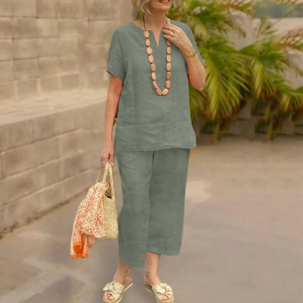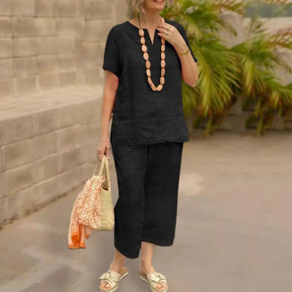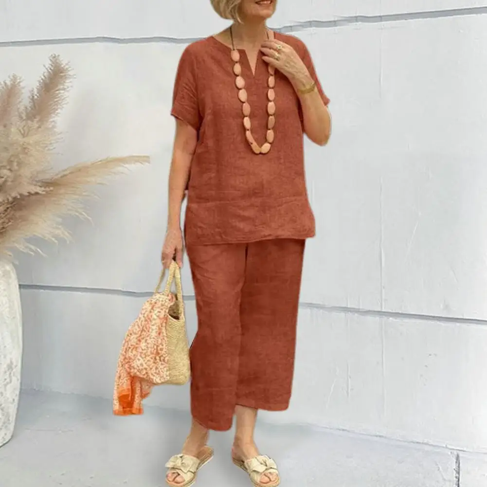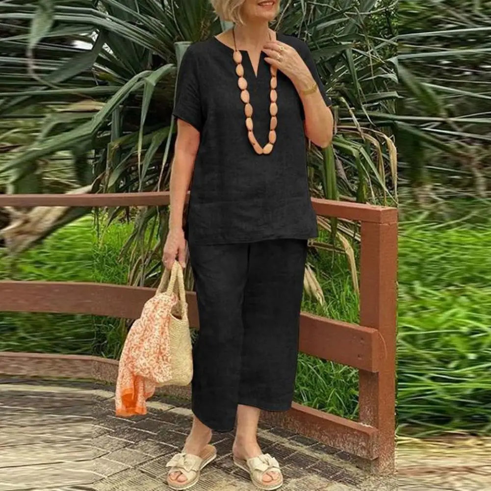 2Pcs/Set Women's Cotton Linen Summer Suit Casual Loose Fit Wide Leg Pants Solid Color Stylish Ladies Suit Summer Supply