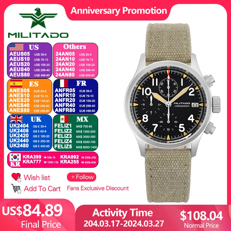 Militado Retro VK67 Quartz Chronograph Watch 39mm 316L Stainless Steel Case 3 Dial Waterproof 100M Multifunction Military Watch