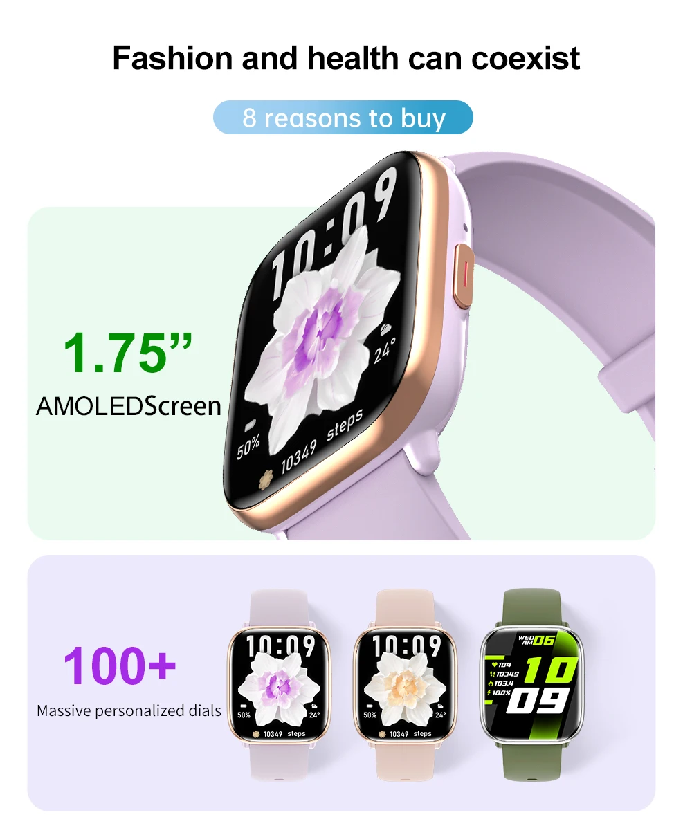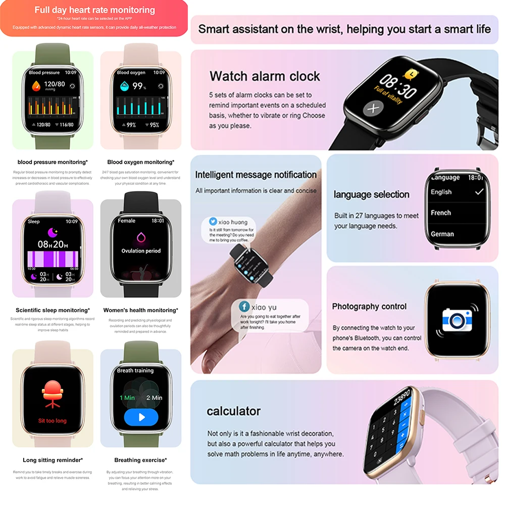 >>Basic perform: Bluetooth name,Date, week, climate forecast,Step counter, coronary heart charge, blood stress, blood oxygen, distance, energy,Automatic sleep monitoring,Supports making and connecting calls (name perform),suitable with VC32 true blood oxygen,Real-time coronary heart charge detection, coronary heart charge alarm,Fitness info sharing,Sports objective setting,GPS observe for working, strolling, biking,Incoming name, contact reminder,Alarm reminder,Used for message reminder don’t disturb,Password lock perform,Women's well being reminder.