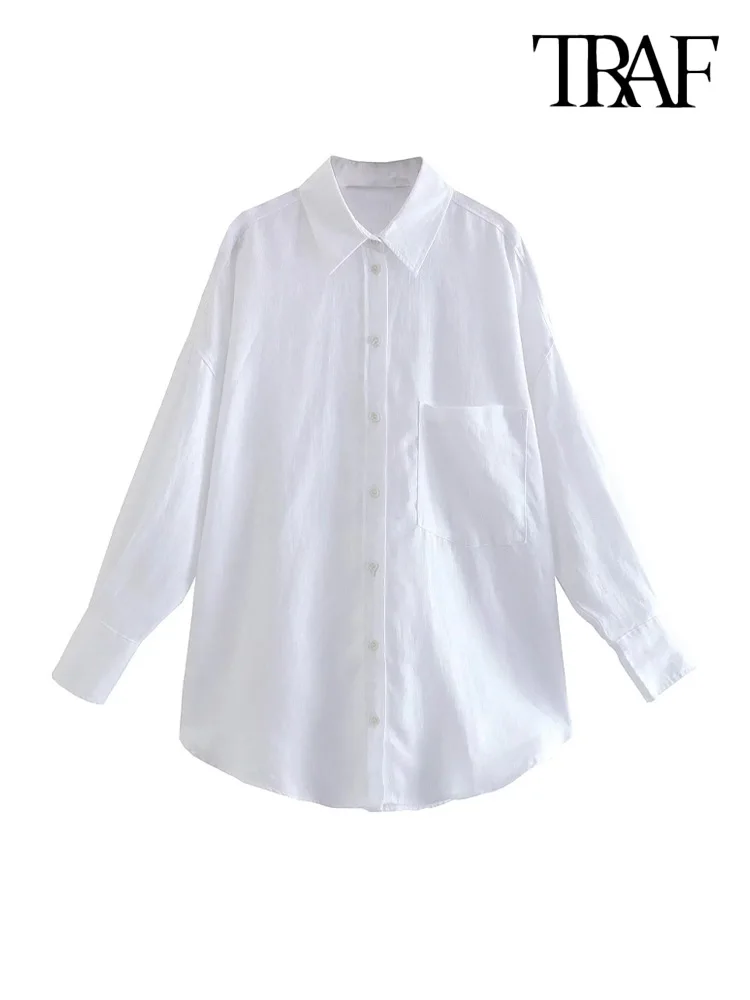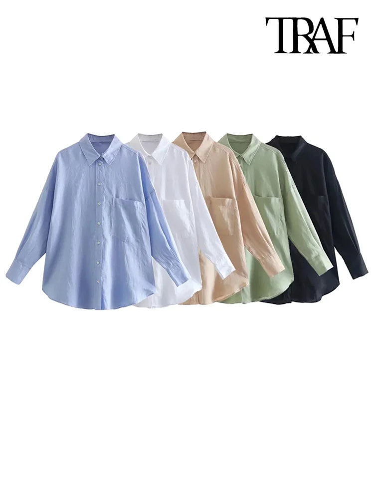 Home Uncategorized TRAF Women Fashion With Pocket Oversized Linen Shirts Vintage Long Sleeve Button-up Female Blouses Blusas Chic Tops