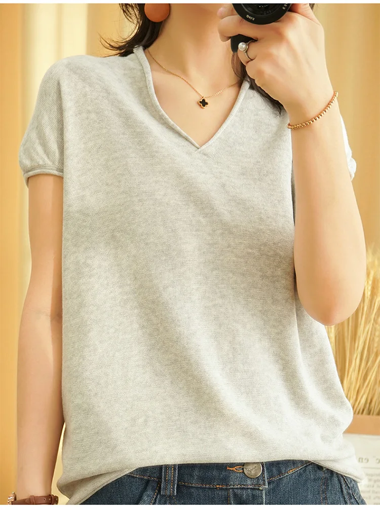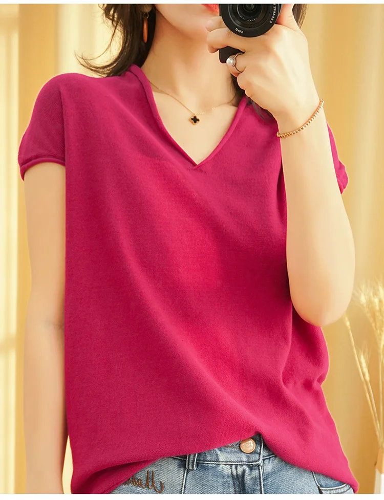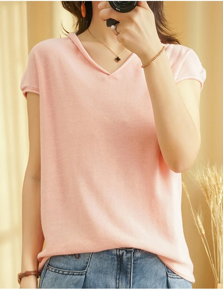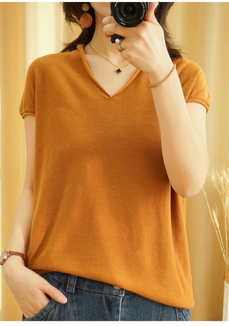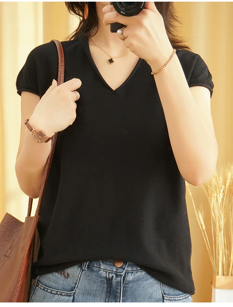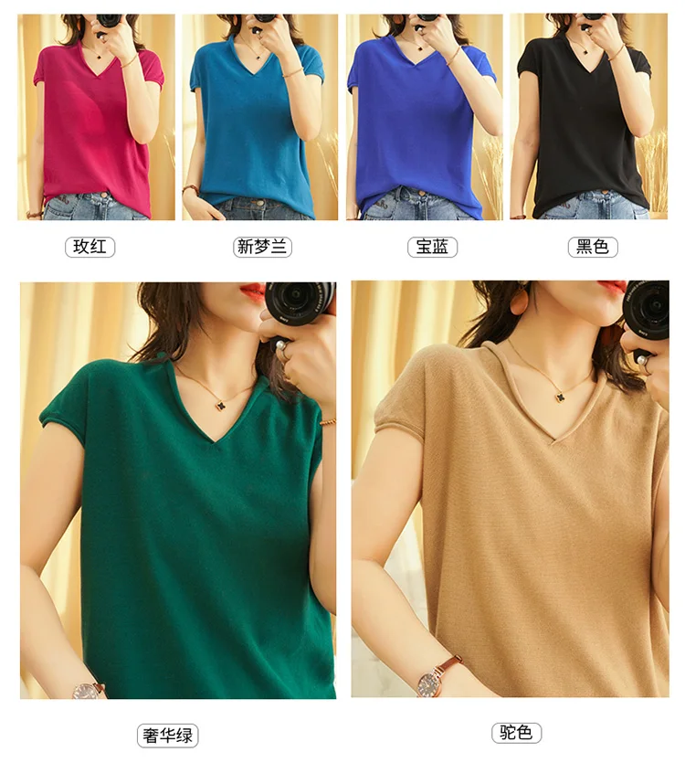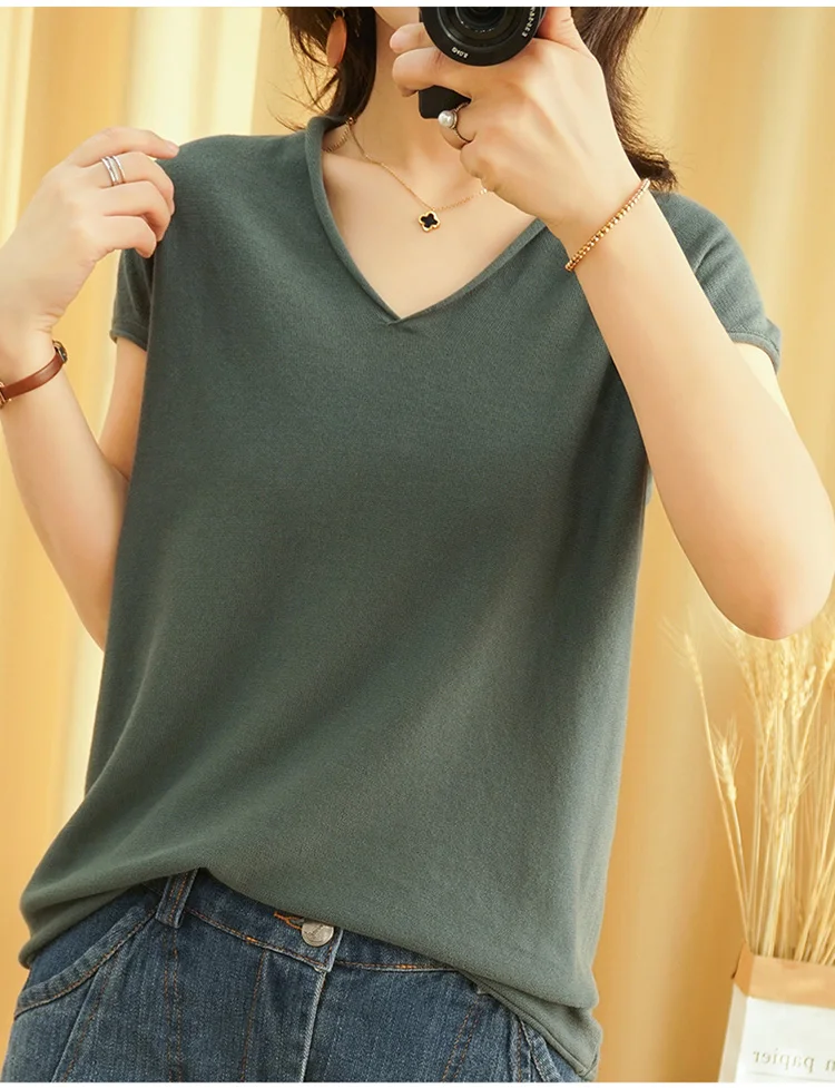 Women’s T-shirt Summer New 100% Pure Cotton Tees Casual Solid Knitted Short sleeved V-neck Pullover Loose Tops Fashion Sweater