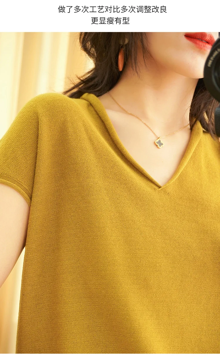 Home Uncategorized Women’s T-shirt Summer New 100% Pure Cotton Tees Casual Solid Knitted Short sleeved V-neck Pullover Loose Tops Fashion Sweater