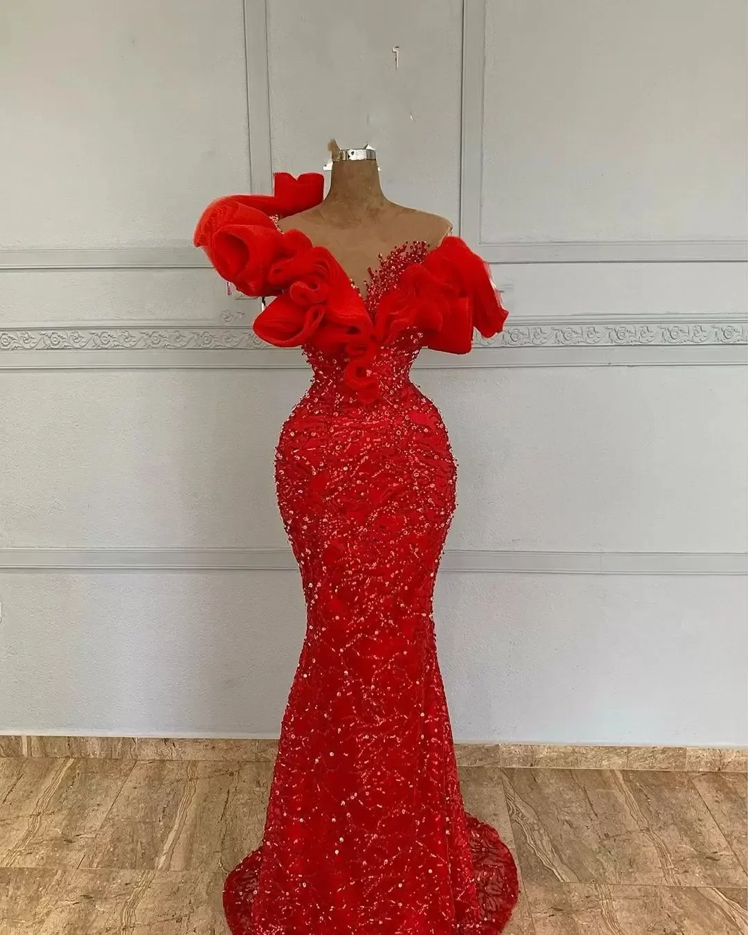 Home Uncategorized Aso Ebi Mermaid Prom Dresses Ruffles Off Shoulder Sparkly Sequins Red Formal Evening Gowns African Pageant Special Occasion Wear