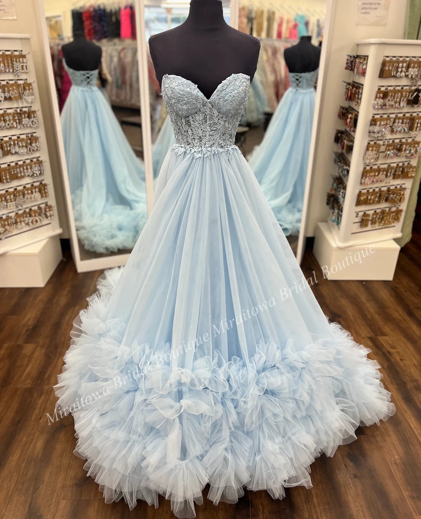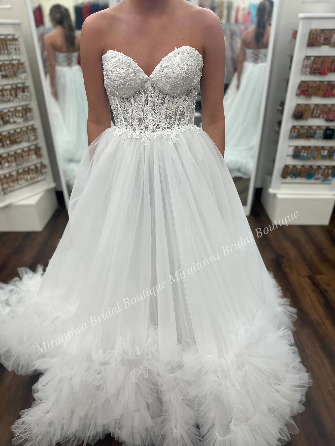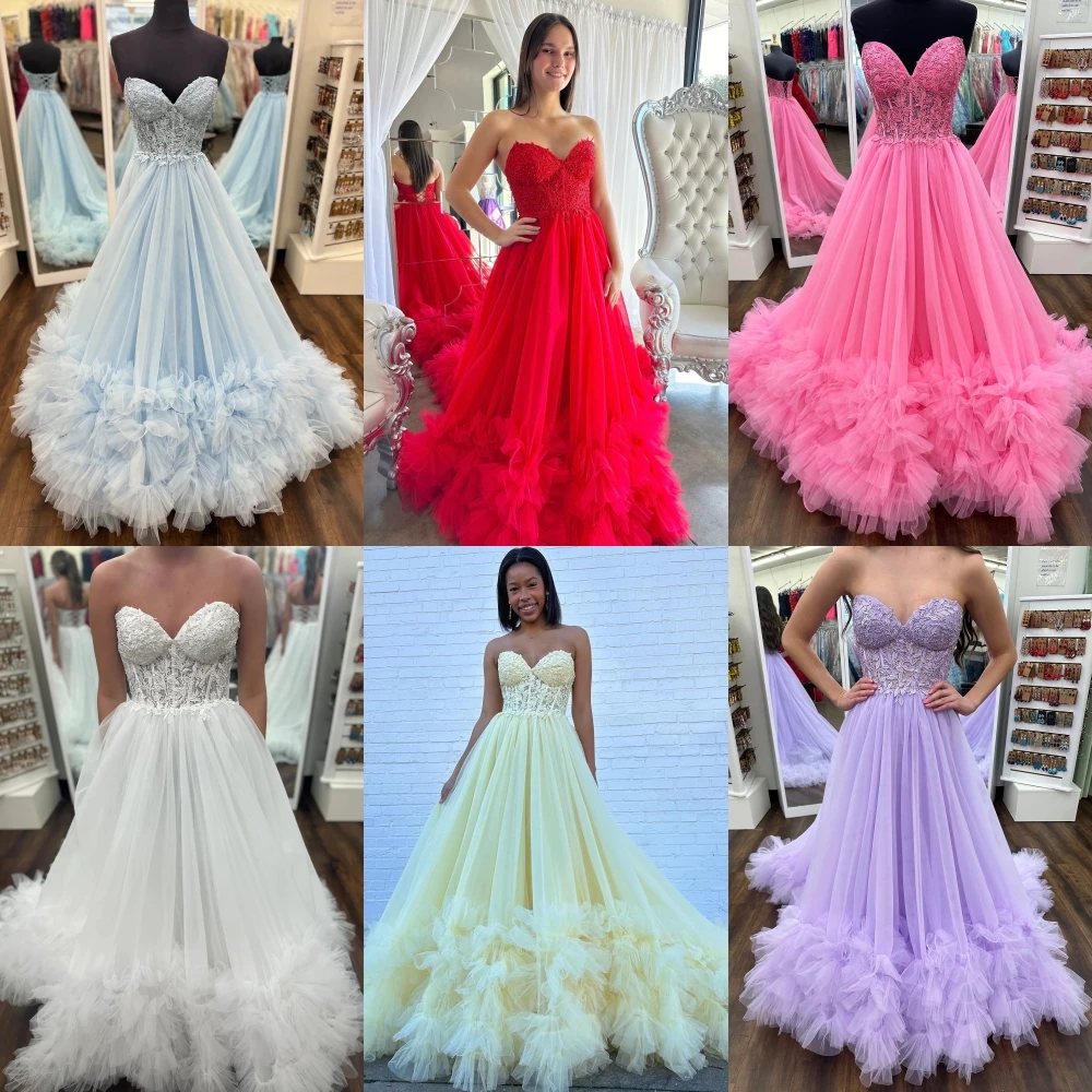 Looking to make an eternal impression? Look no additional, this extremely lengthy A-line costume is the proper choose! Featuring a fitted and adjustable lace corset bodice together with a voluminous tulle sweep prepare, this flattering costume options ruffled tulle all through the hem that fantastically enhances the lengthy sweep prepare.