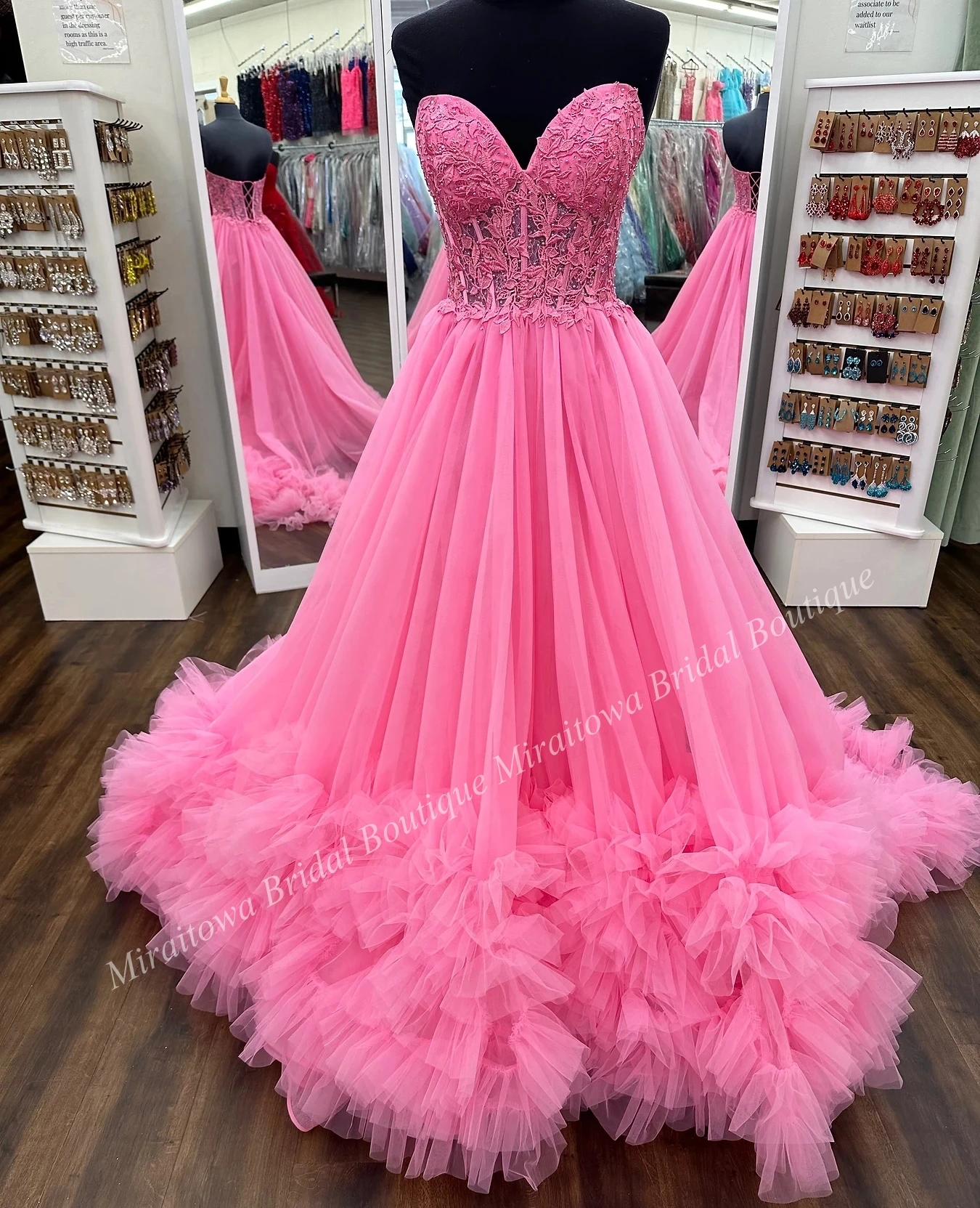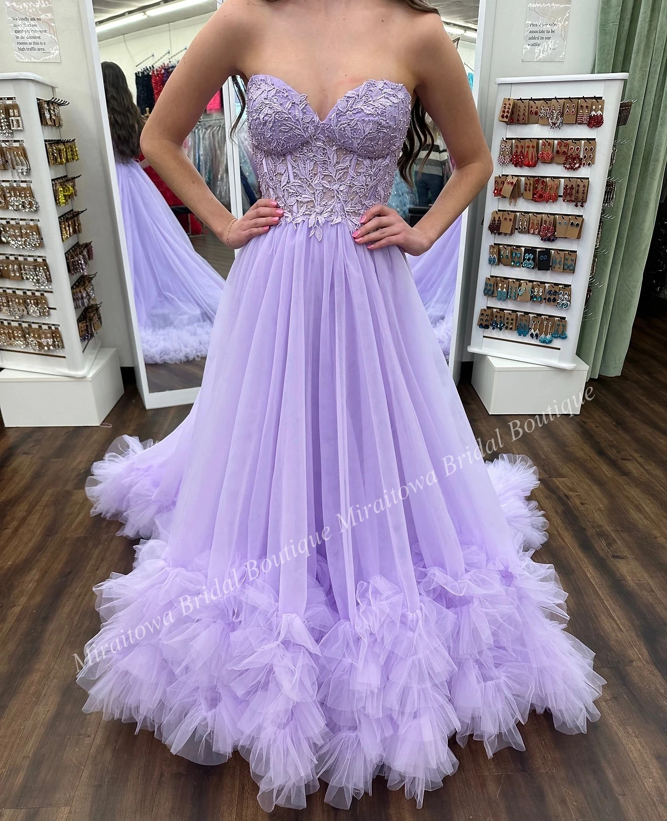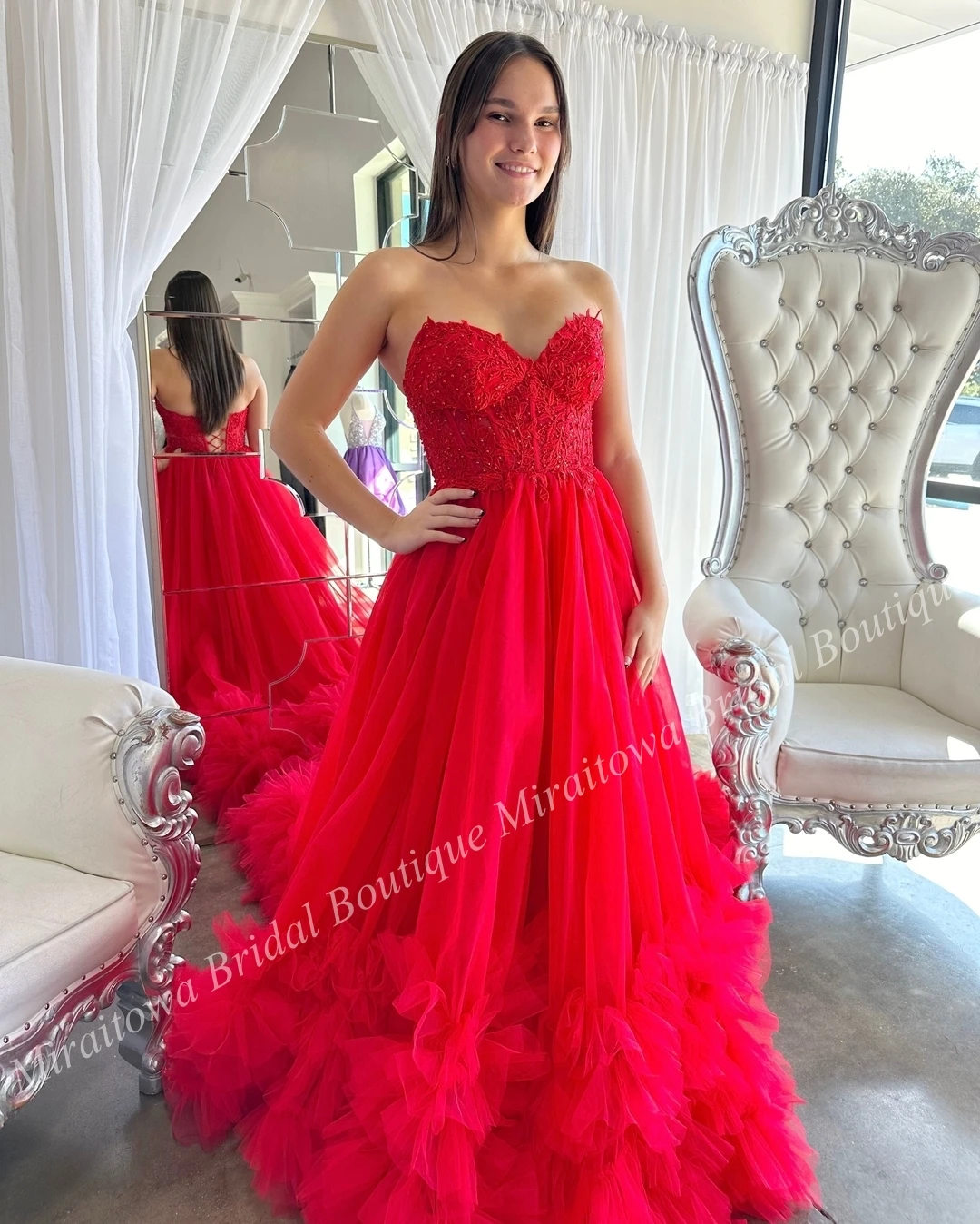 Looking to make an eternal impression? Look no additional, this extremely lengthy A-line costume is the proper choose! Featuring a fitted and adjustable lace corset bodice together with a voluminous tulle sweep prepare, this flattering costume options ruffled tulle all through the hem that fantastically enhances the lengthy sweep prepare.