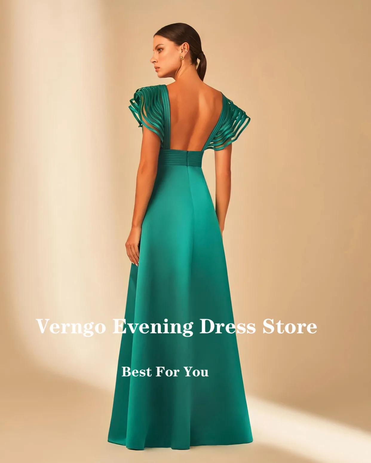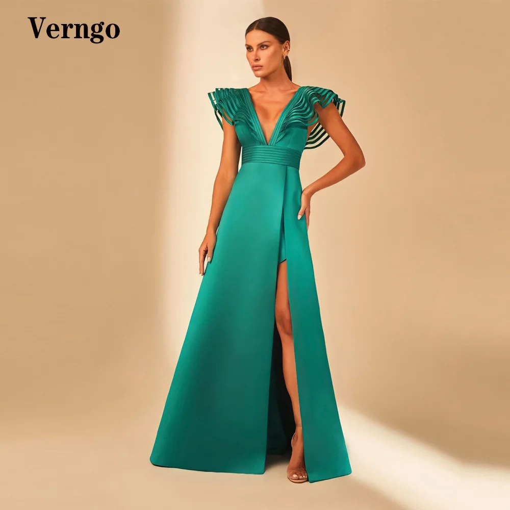 Verngo Modern Green A Line Satin Evening Dresses Cap  Sleeves V Neck Side Slit Long Prom Gowns Women 2023 Special Occasion Dress