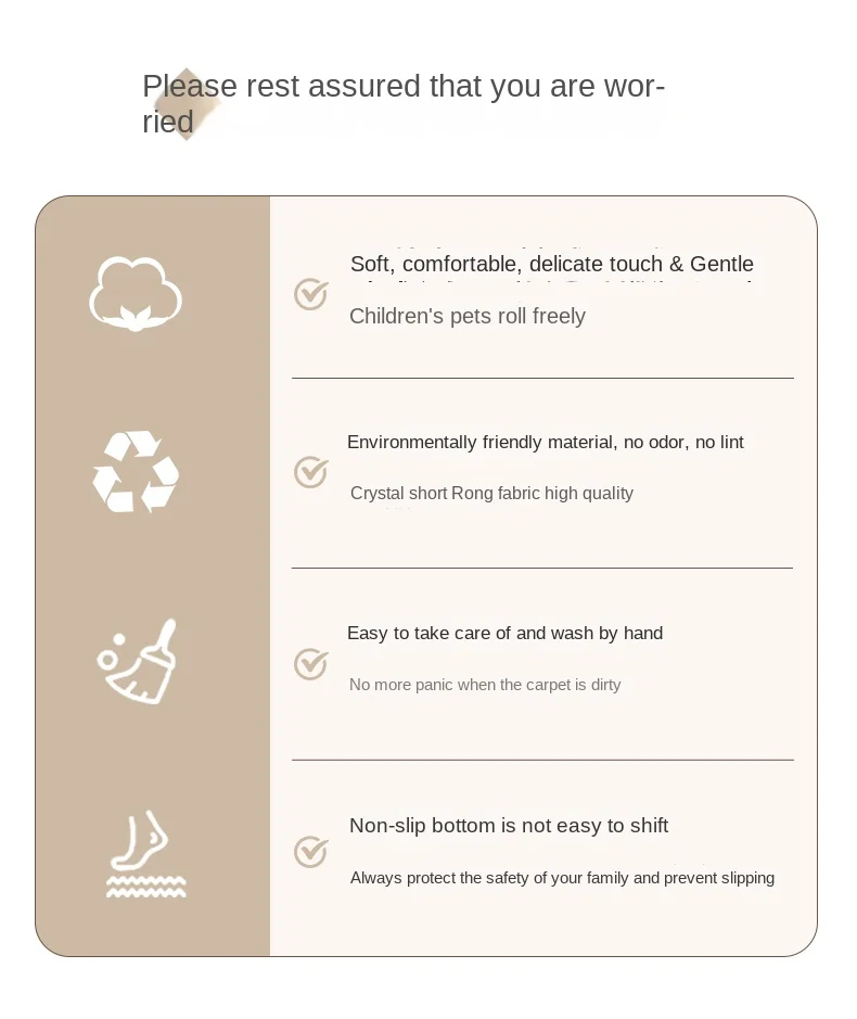 In order to stop giant packages from being returned as a result of customs clearance failure, giant packages must be vacuum folded and despatched, and there shall be creases when opened. After unpacking, wait for the carpet to get better. Creases will disappear over time and may also be resolved by ironing. Hope you perceive.
