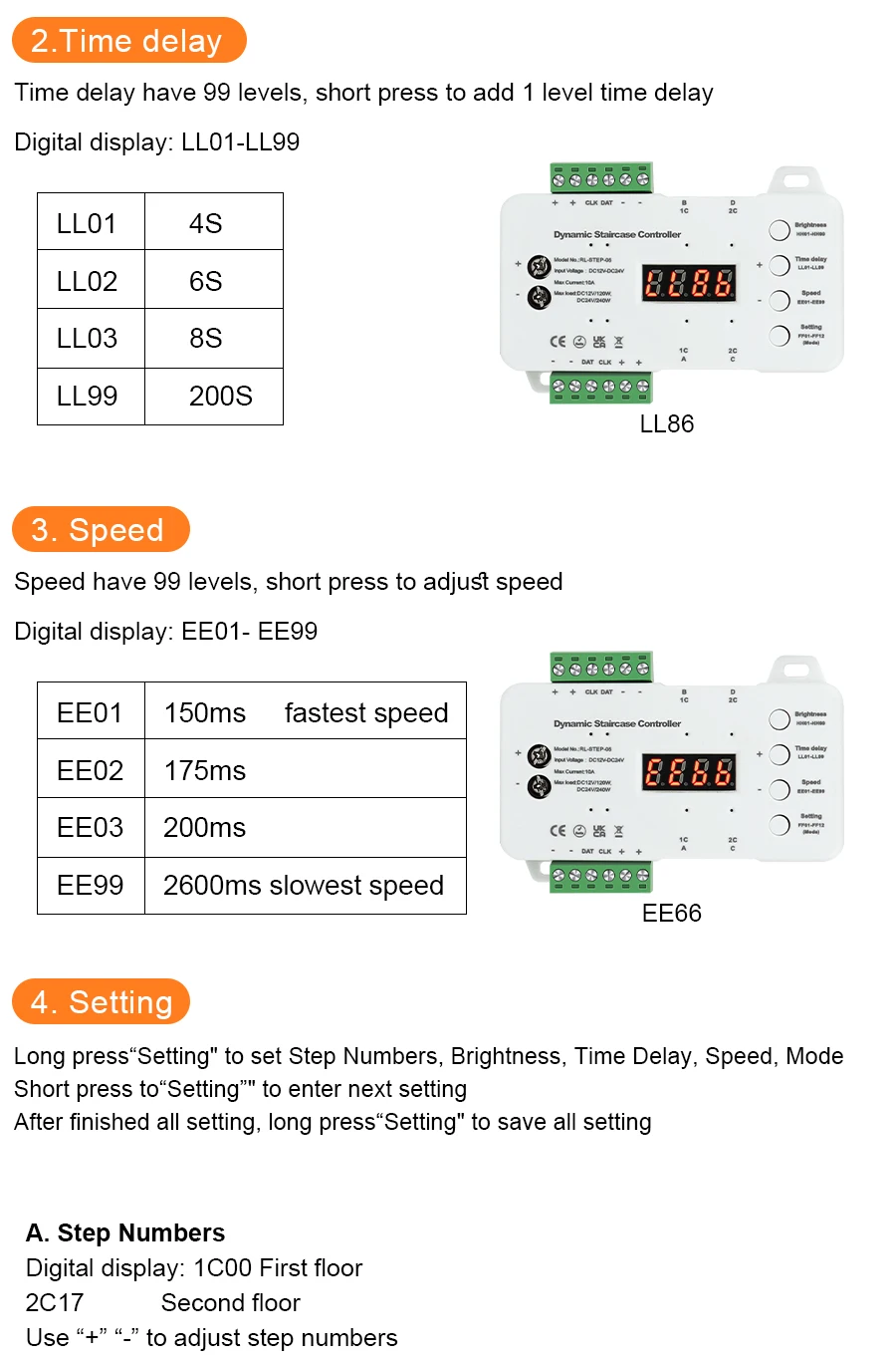 Long press“Setting" to set Step Numbers, Brightness, Time Delay, Speed, Mode