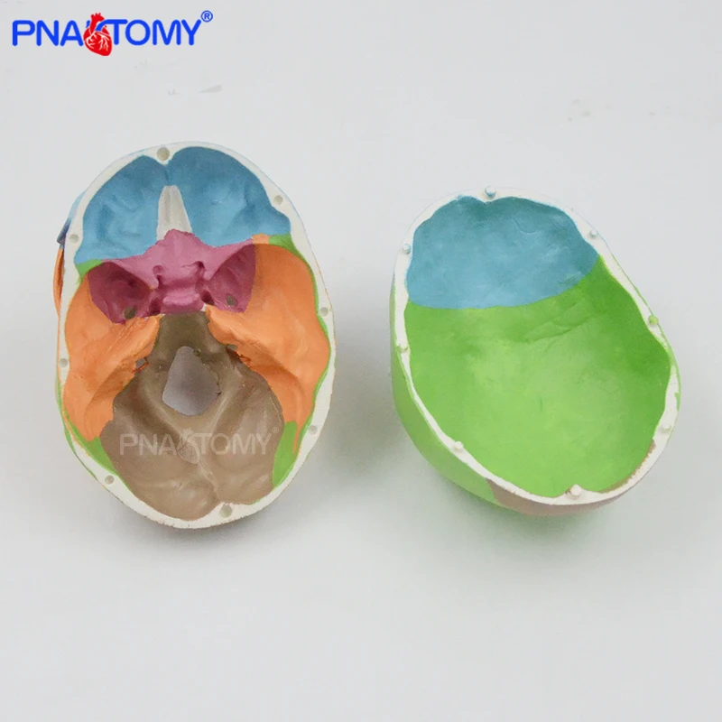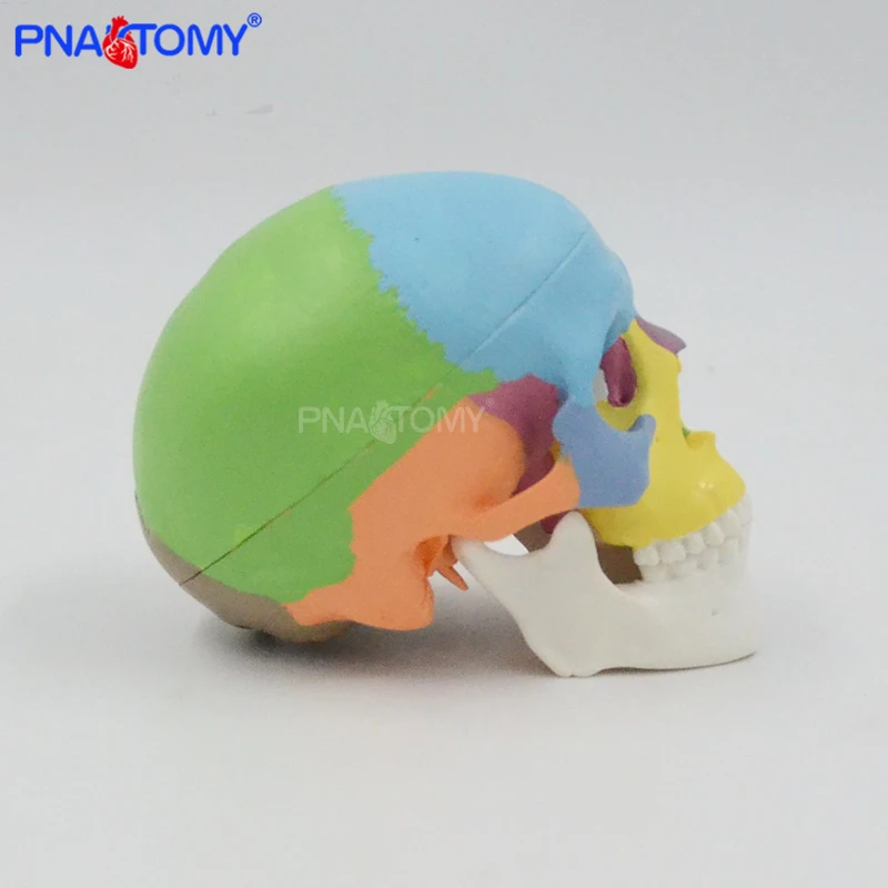 This is coloured mini cranium mannequin,3 elements.The skullcap is detachable to indicate the inner construction of the cranium. The mandible is articulated and detachable.