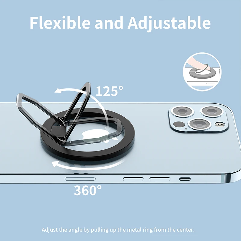 Adjustable angle, extra versatile operation, 360° rotatable and foldable finger holder.