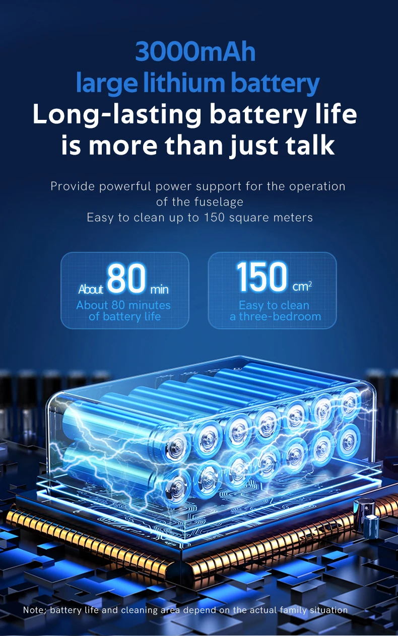 13.3000mah giant lithium battery, 80 minutes lengthy battery life, straightforward to scrub 150 sq. meters.